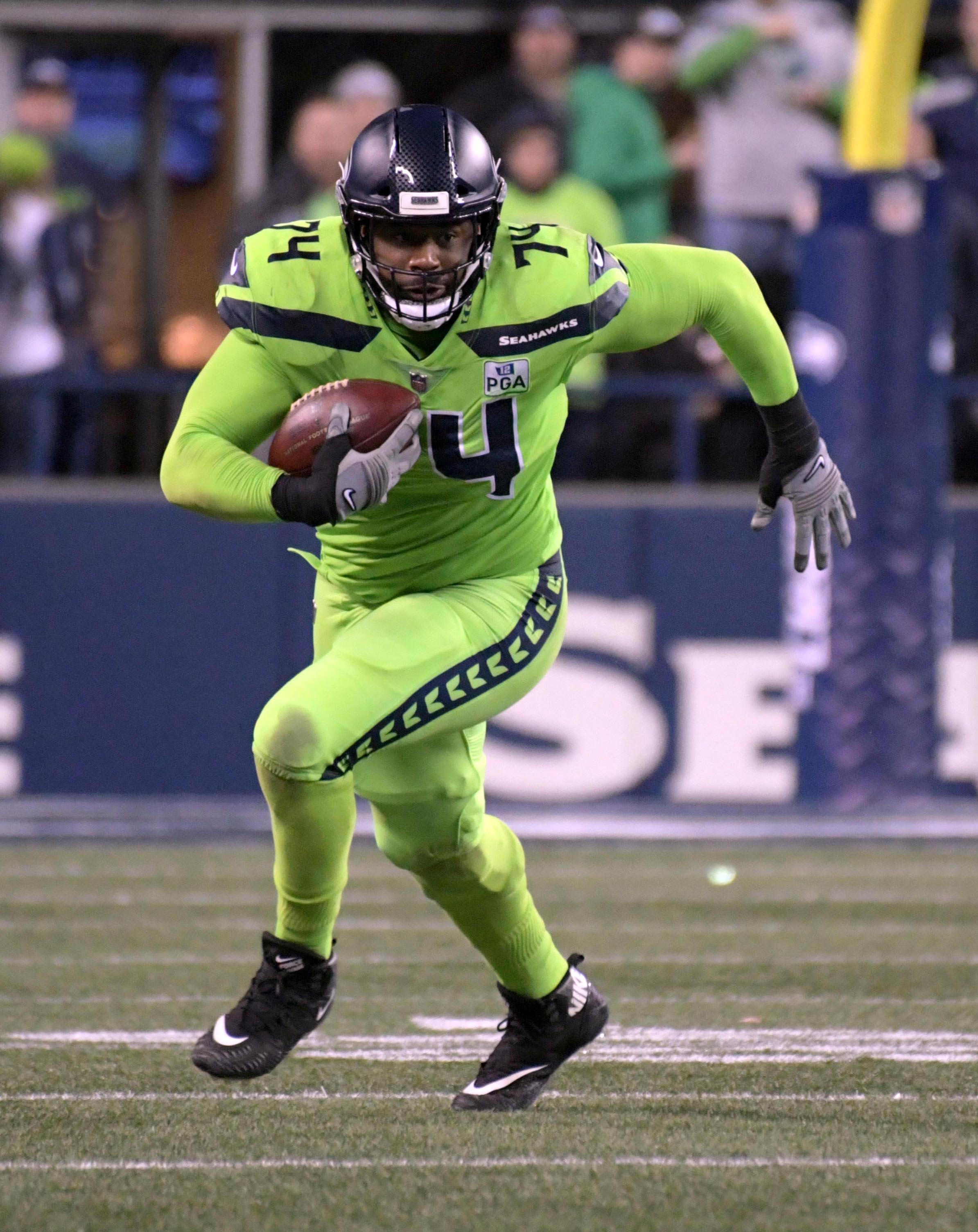 Dec 10, 2018; Seattle, WA, USA; Seattle Seahawks offensive tackle George Fant (74) carries the ball on a pass reception in the third quarter against the Minnesota Vikings at CenturyLink Field. The Seahawks defeated the Vikings 21-7. Mandatory Credit: Kirby Lee-USA TODAY Sports / Kirby Lee
