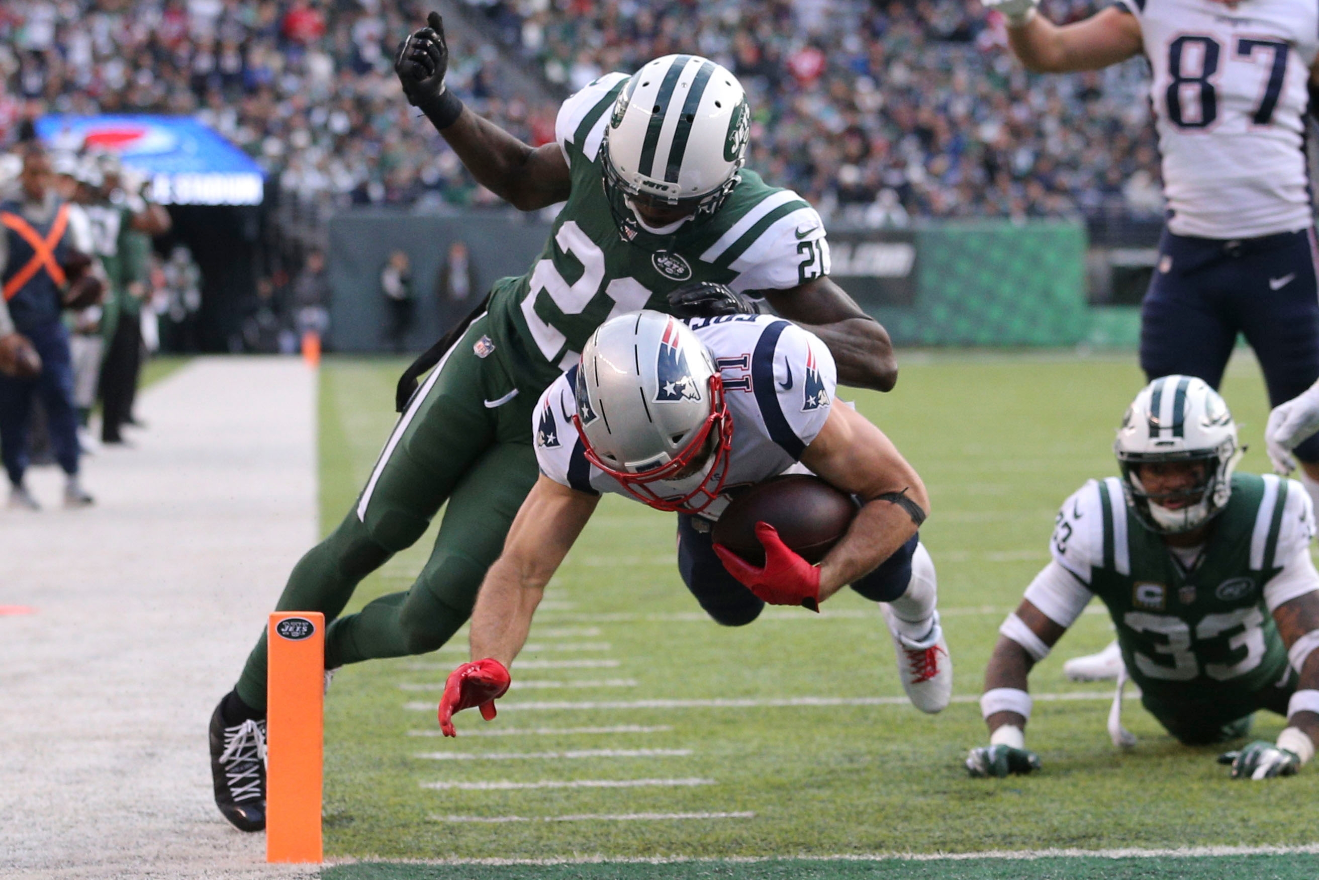 New England Patriots wide receiver Julian Edelman scores a touchdown against New York Jets cornerback Morris Claiborne during the third quarter at MetLife Stadium. / Brad Penner/USA TODAY Sports