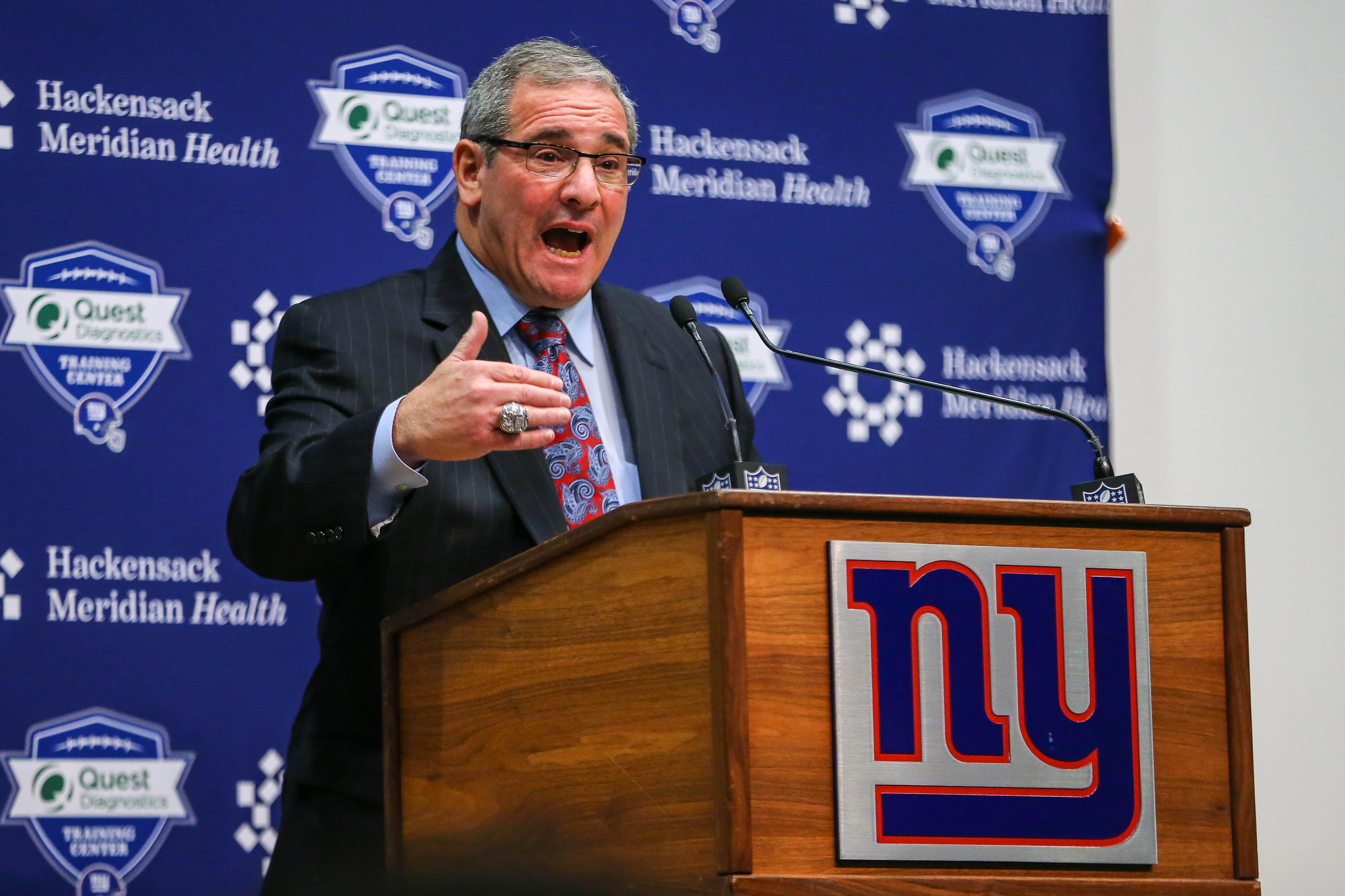 Dec 29, 2017; East Rutherford, NJ, USA; New York Giants general manager Dave Gettleman addresses the media at Quest Diagnostics Training Center. Mandatory Credit: Vincent Carchietta-USA TODAY Sports / Vincent Carchietta