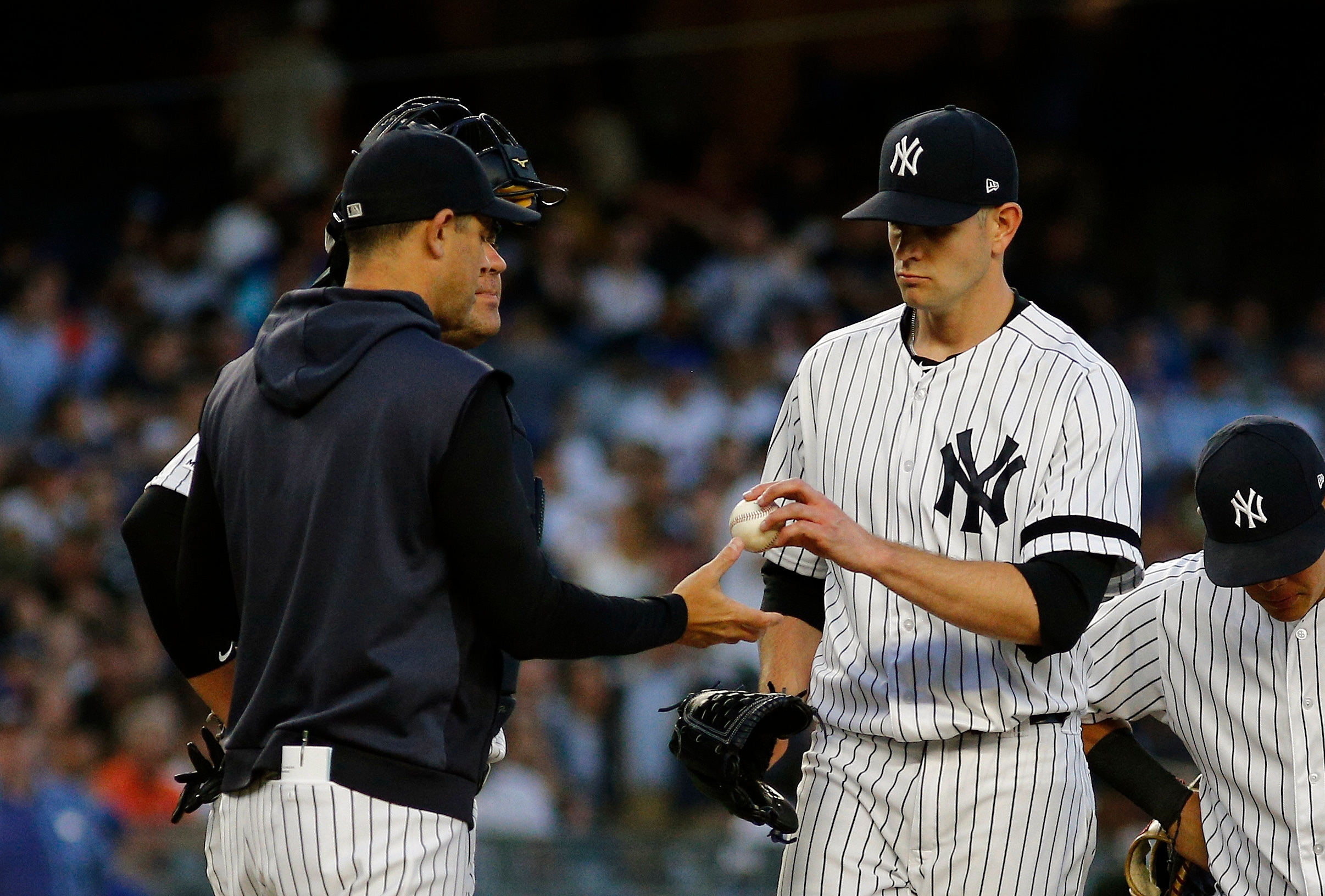 Jun 11, 2019; Bronx, NY, USA; New York Yankees starting pitcher James Paxton (65) hands the ball to manager Aaron Boone (17) after being taken out of the game against the New York Mets during the third inning of game two of a doubleheader at Yankee Stadium. Mandatory Credit: Andy Marlin-USA TODAY Sports / Andy Marlin