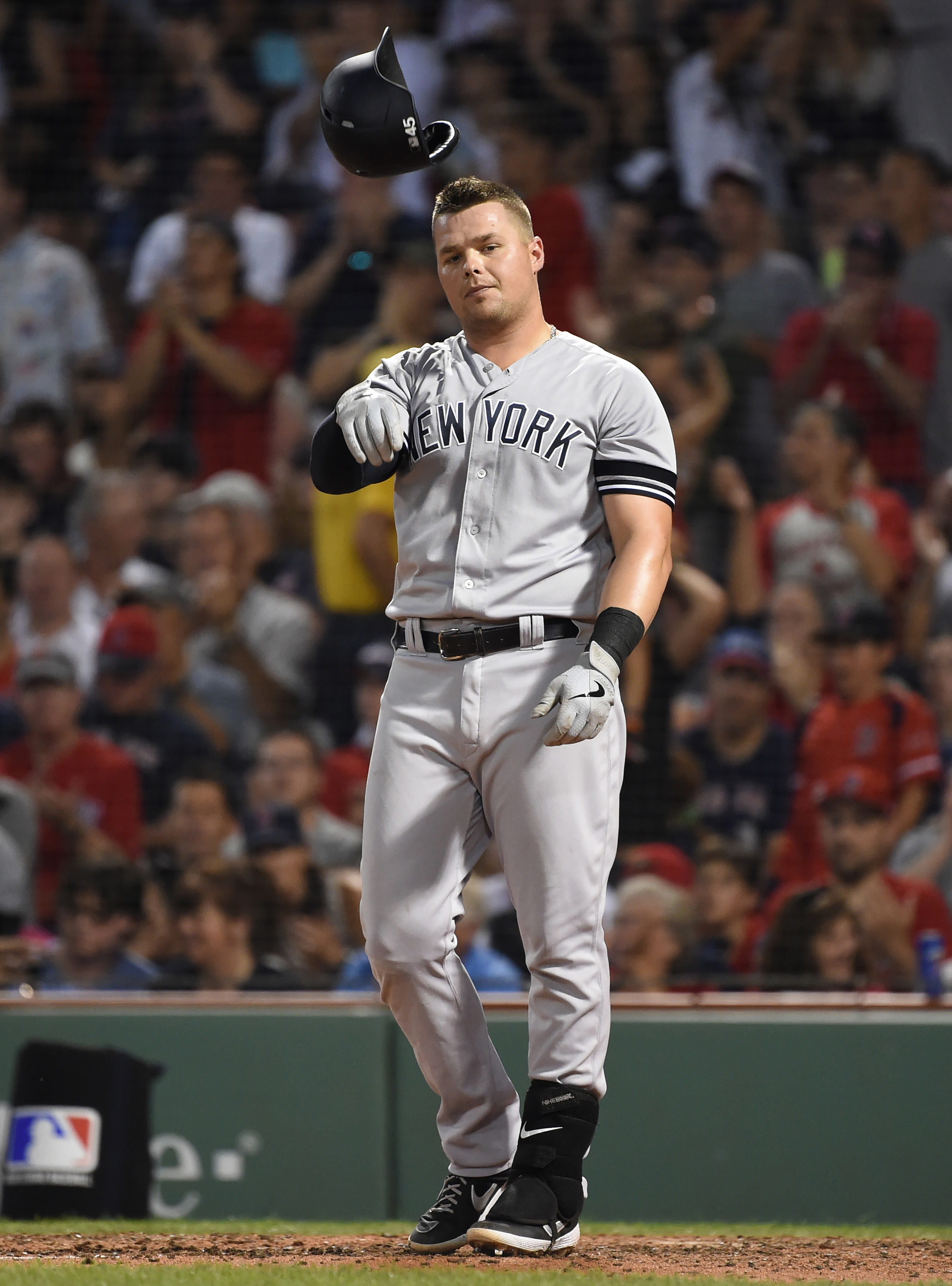 Jul 28, 2019; Boston, MA, USA; New York Yankees first baseman Luke Voit (45) throws his helmet after striking out during the fourth inning against the Boston Red Sox at Fenway Park. Mandatory Credit: Bob DeChiara-USA TODAY Sports / Bob DeChiara