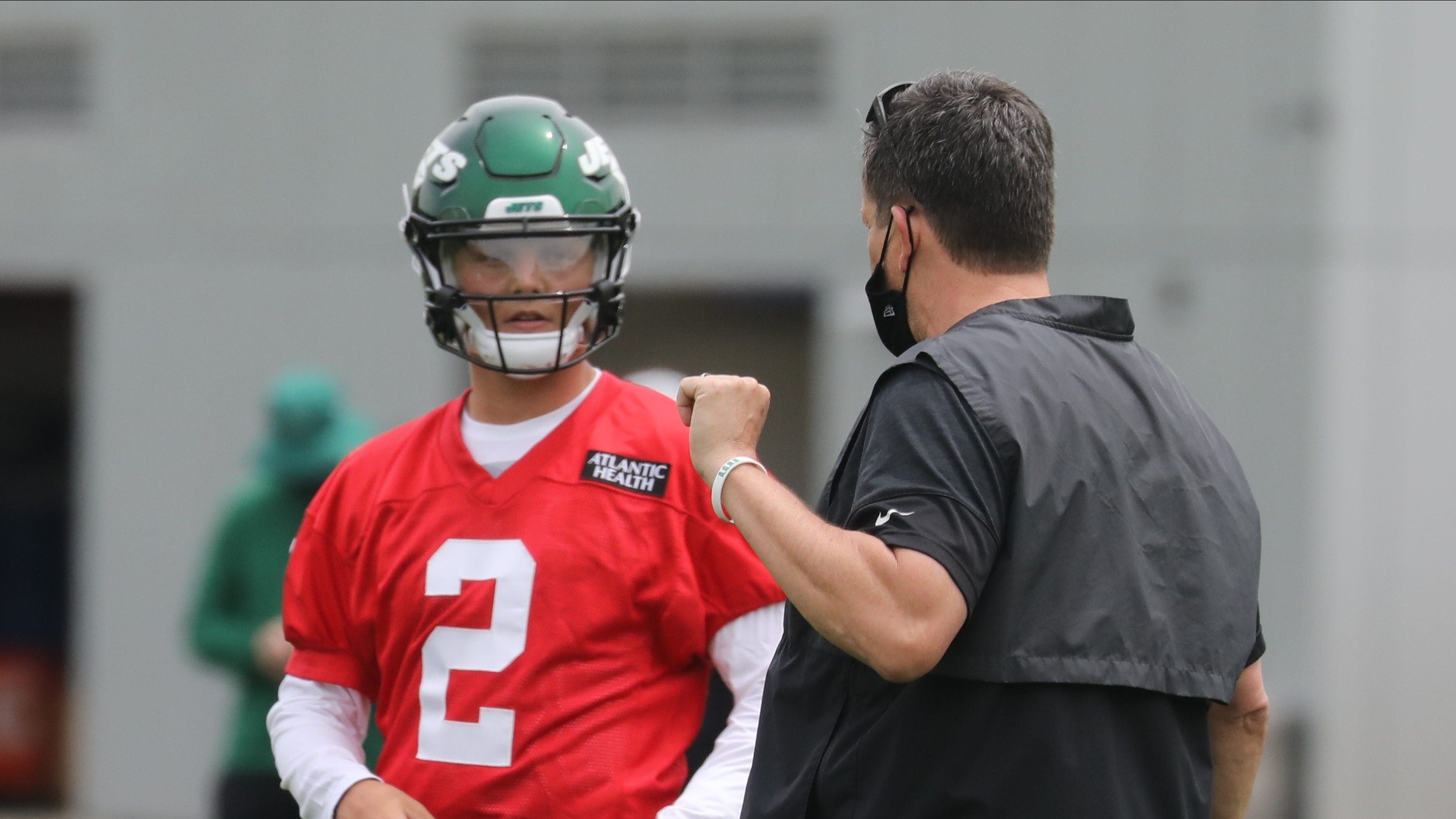 The new Jets quarterback Zach Wilson with Greg Knapp, passing game specialist at the NY Jets rookie mini camp in Florham Park, NJ on May 7, 2021. / Chris Pedota, NorthJersey.com