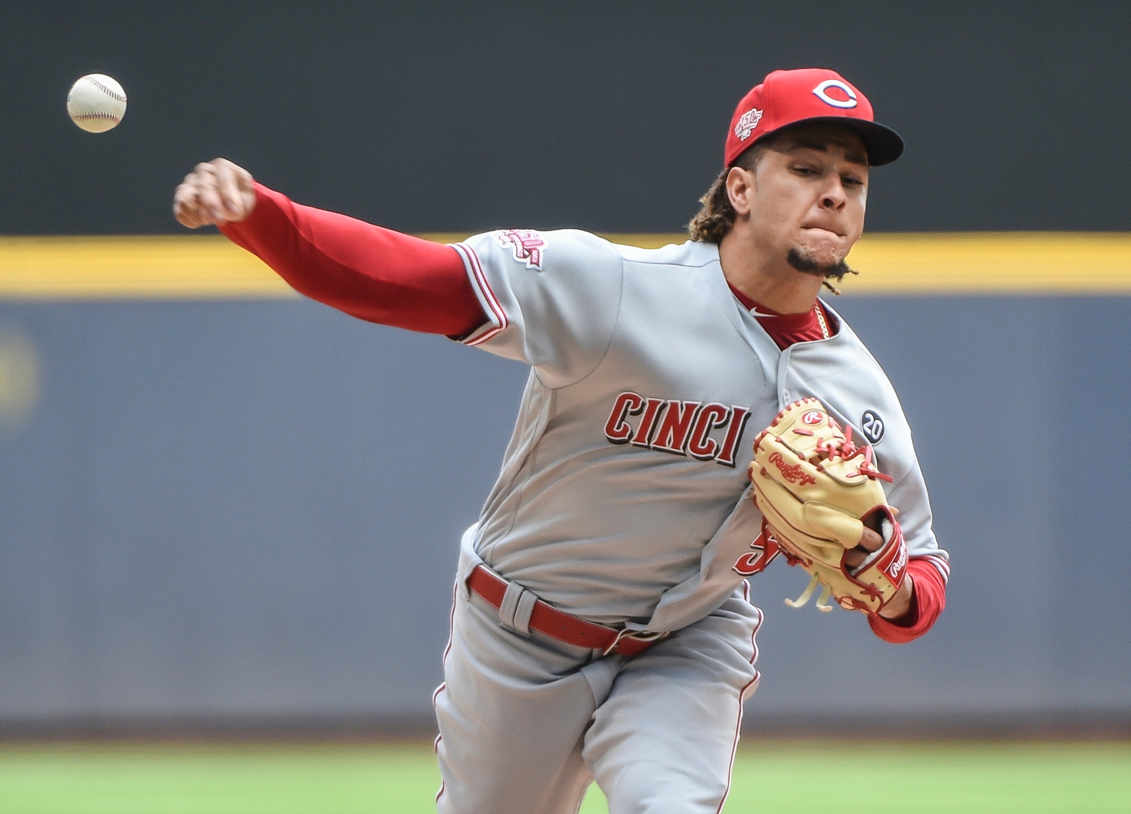 Jun 22, 2019; Milwaukee, WI, USA; Cincinnati Reds pitcher Luis Castillo (58) throws a pitch in the first inning against the Milwaukee Brewers at Miller Park. Mandatory Credit: Benny Sieu-USA TODAY Sports / Benny Sieu