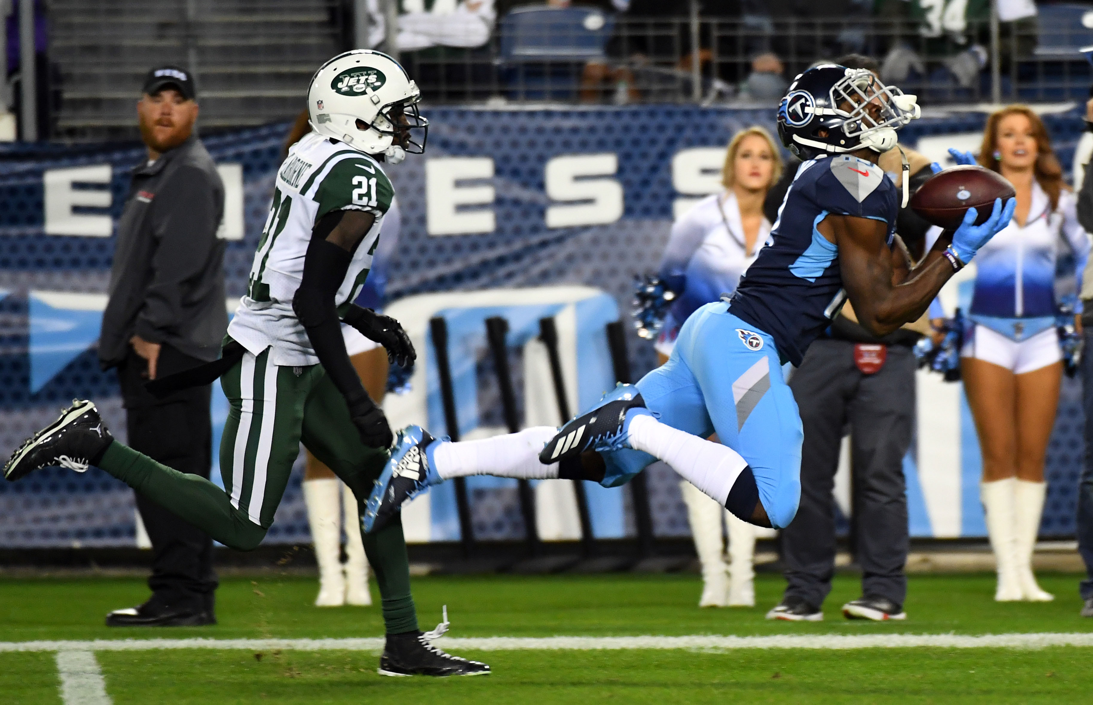 Tennessee Titans wide receiver Taywan Taylor catches a pass in front of coverage by New York Jets cornerback Morris Claiborne during the second half at Nissan Stadium. / Christopher Hanewinckel/USA TODAY Sports