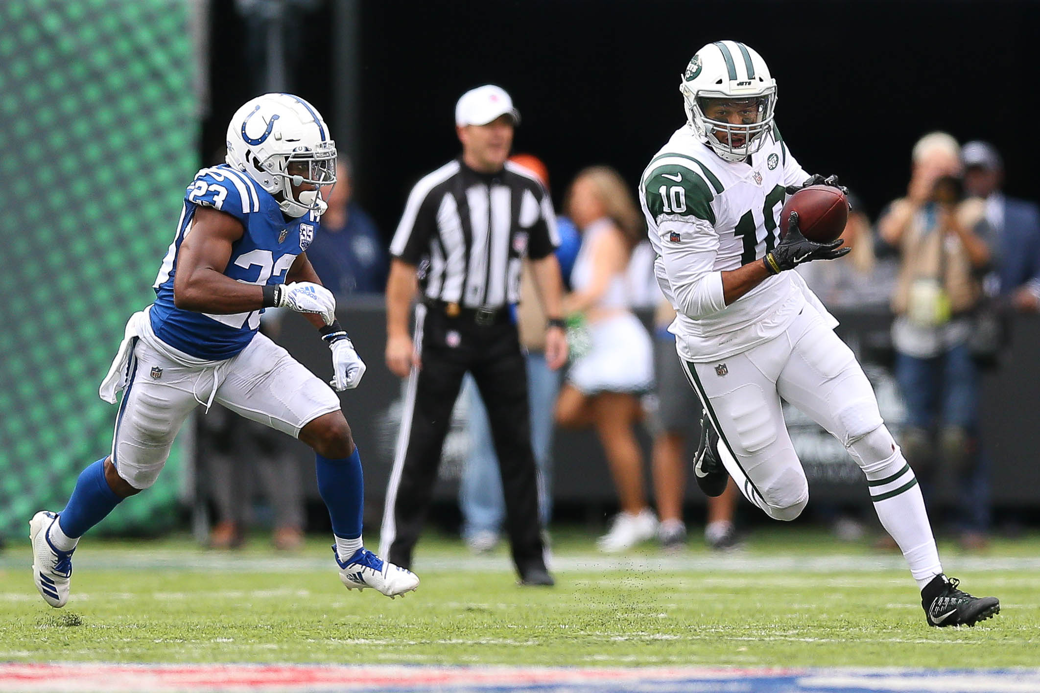 Oct 14, 2018; East Rutherford, NJ, USA; New York Jets wide receiver Jermaine Kearse (10) rushes for yards after a catch as Indianapolis Colts cornerback Kenny Moore (23) pursues during the second half at MetLife Stadium. Mandatory Credit: Vincent Carchietta-USA TODAY Sports / Vincent Carchietta