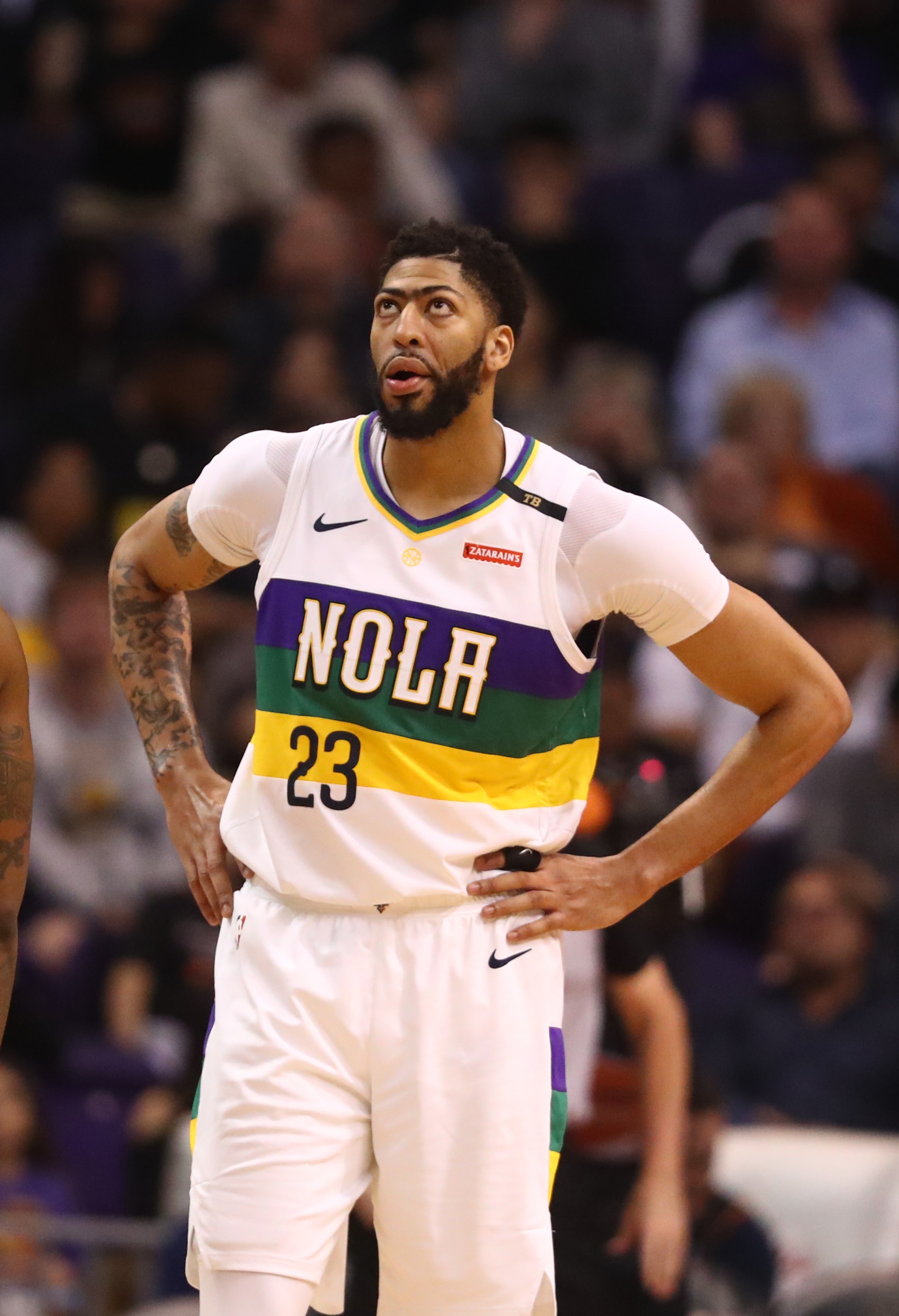 New Orleans Pelicans forward Anthony Davis reacts against the Phoenix Suns in the second half at Talking Stick Resort Arena. / Mark J. Rebilas/USA TODAY Sports