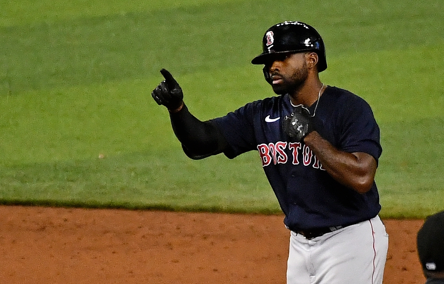 Sep 15, 2020; Miami, Florida, USA; Boston Red Sox center fielder Jackie Bradley Jr. (19) reacts after doubling in a run in the 6th inning against the Miami Marlins at Marlins Park. / Jasen Vinlove-USA TODAY Sports
