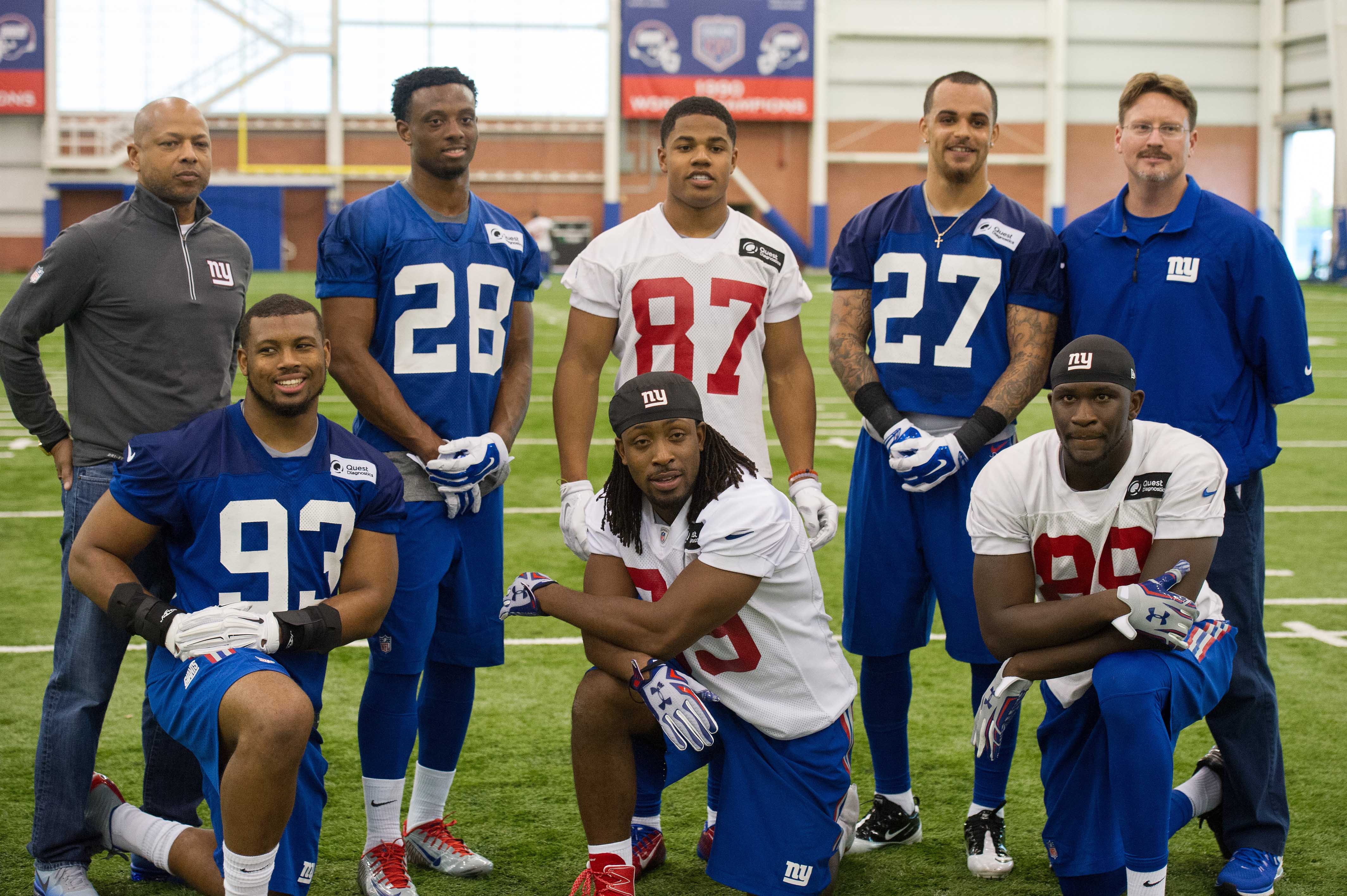 New Giants general manger Jerry Reese, cornerback Eli Apple, wide receiver Sterling Shepard, safety Darian Thompson, head coach Ben MaCadoo, linebacker B.J. Goodson, running back Paul Perkins and tight end Jerrell Adams during rookie minicamp at Quest Diagnostics Training Center. / William Hauser/USA Today Sports Images