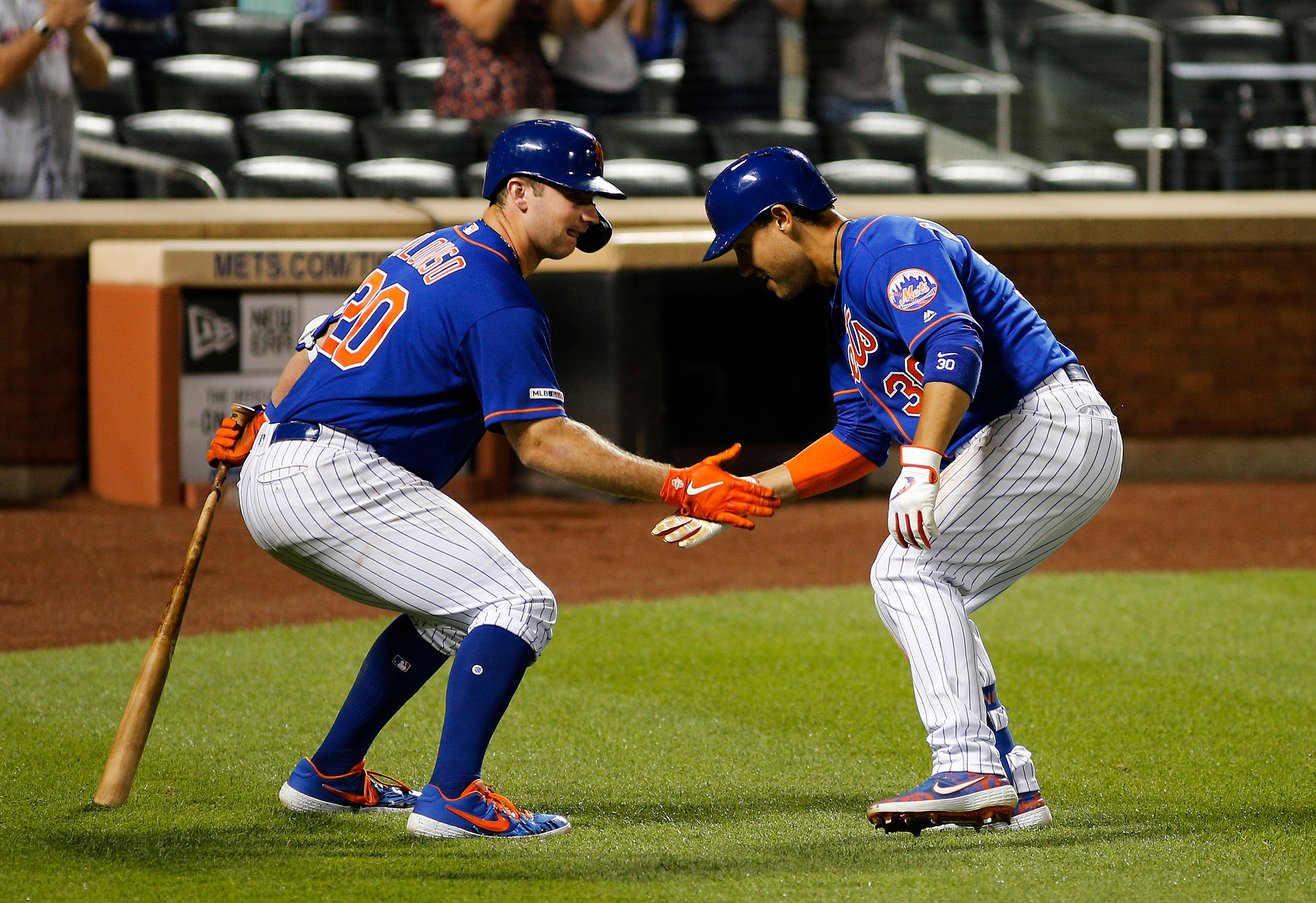 Aug 5, 2019; New York City, NY, USA; New York Mets right fielder Michael Conforto (30) celebrates with first baseman Pete Alonso (20) after hitting a solo home run against the Miami Marlins during the seventh inning of game two of a doubleheader at Citi Field. Mandatory Credit: Andy Marlin-USA TODAY Sports / Andy Marlin
