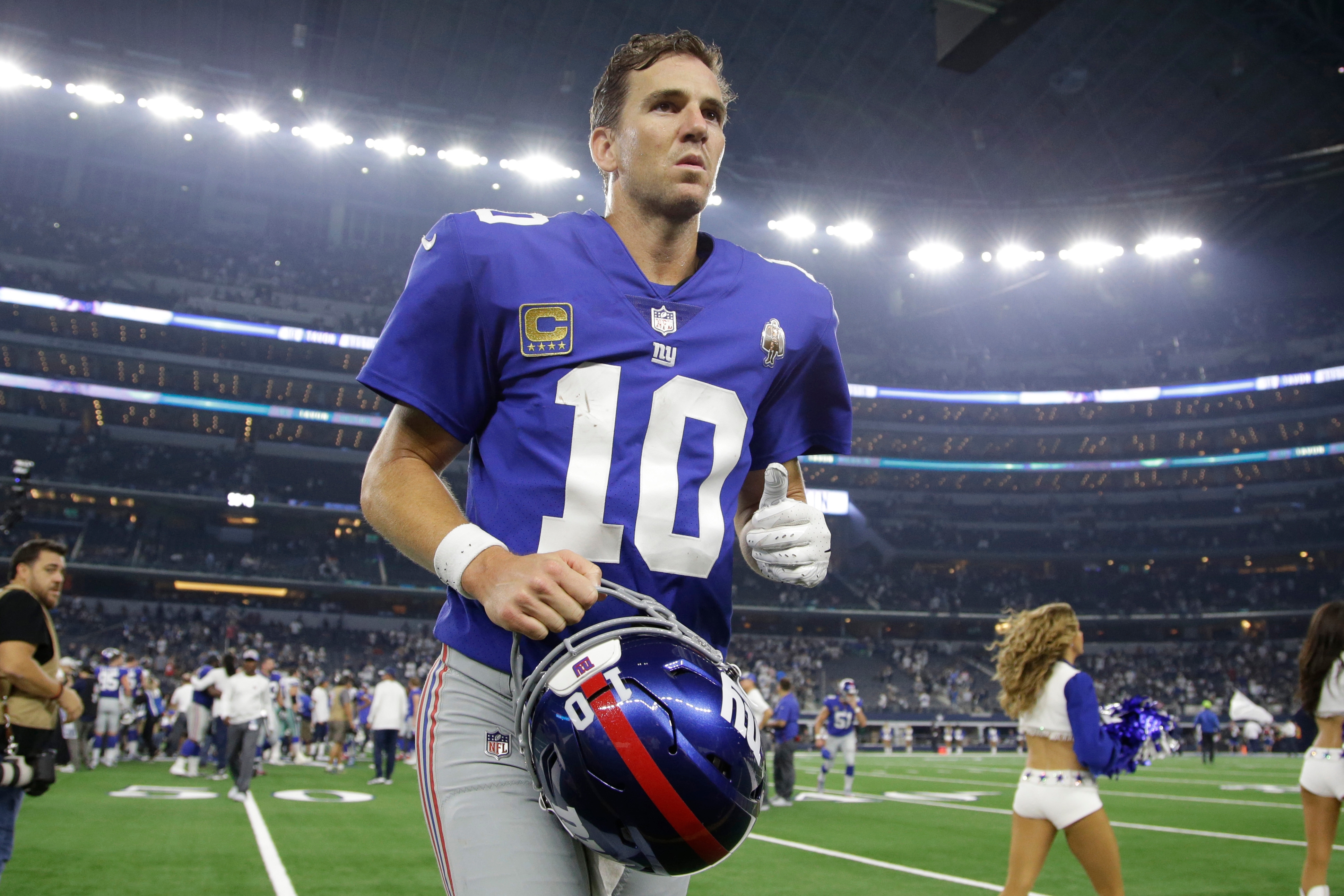 Sep 16, 2018; Arlington, TX, USA; New York Giants quarterback Eli Manning (10) leaves the field after the game against the Dallas Cowboys at AT&T Stadium. Mandatory Credit: Tim Heitman-USA TODAY Sports / Tim Heitman