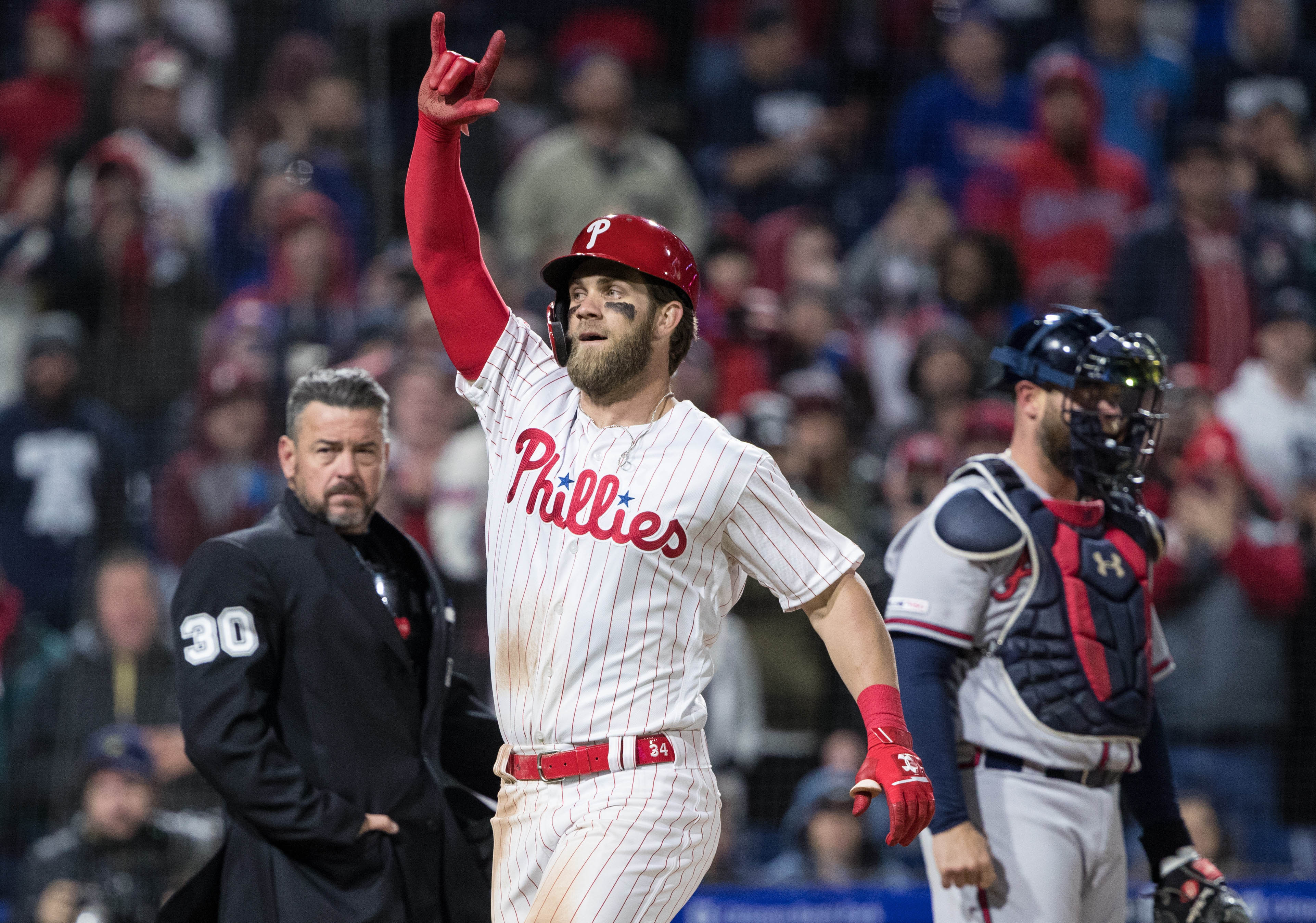 Mar 31, 2019; Philadelphia, PA, USA; Philadelphia Phillies right fielder Bryce Harper (3) reacts as he crosses home plate in front of Atlanta Braves catcher Brian McCann (16) after hitting a home run during the seventh inning at Citizens Bank Park. Mandatory Credit: Bill Streicher-USA TODAY Sports / Bill Streicher