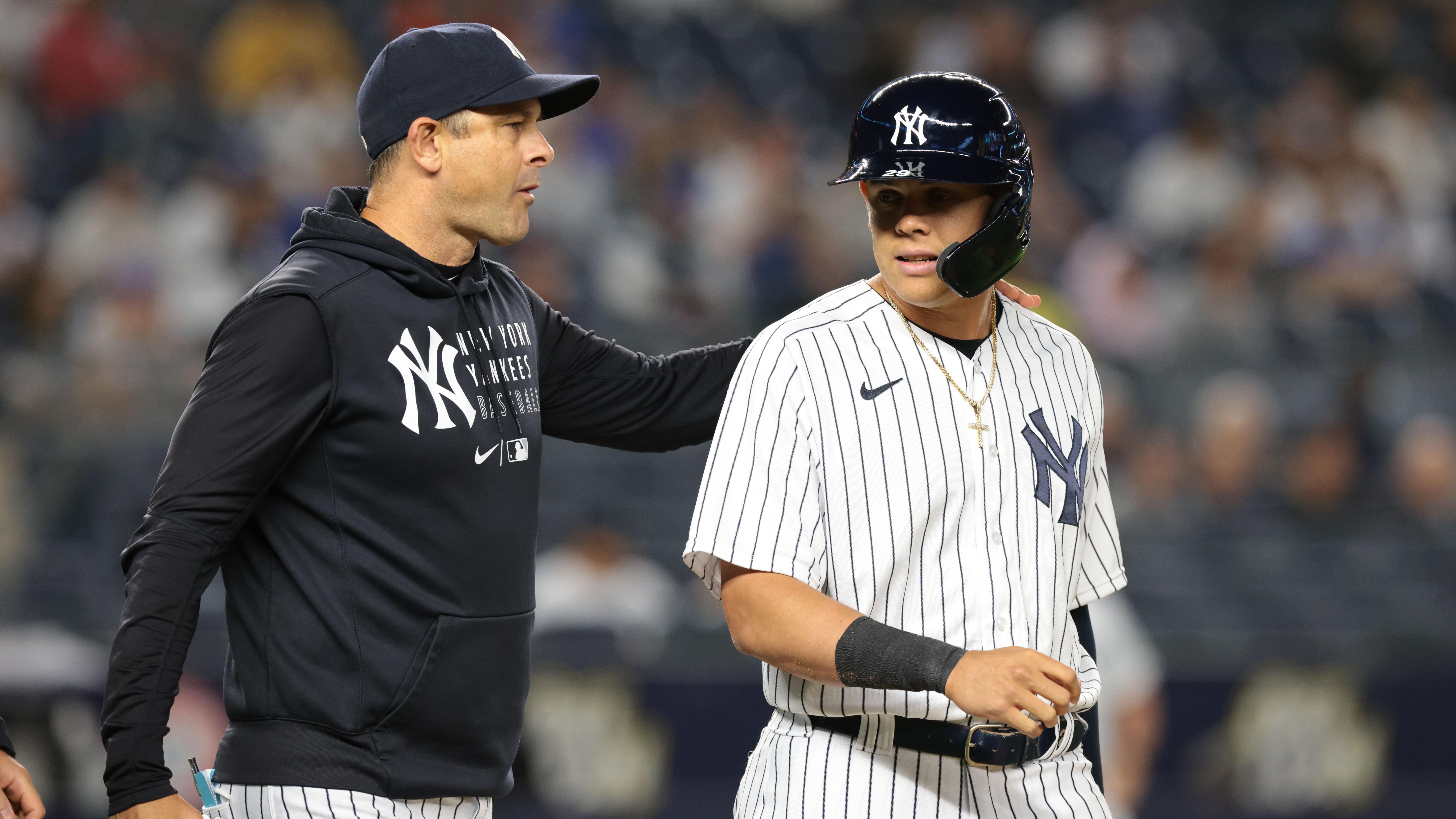Aaron Boone on Yankees' 2021 struggles: 'Our season's on the line'After Red Sox sweep, Yanks are back in fourth place in AL East6/28/2021, 8:54 PMScott ThompsonEditorial ProducerNew York Yankees manager Aaron Boone (17) talks with third baseman Gio Urshela (29) during the seventh inning against the Kansas City Royals at Yankee Stadium. / Vincent Carchietta-USA TODAY Sports