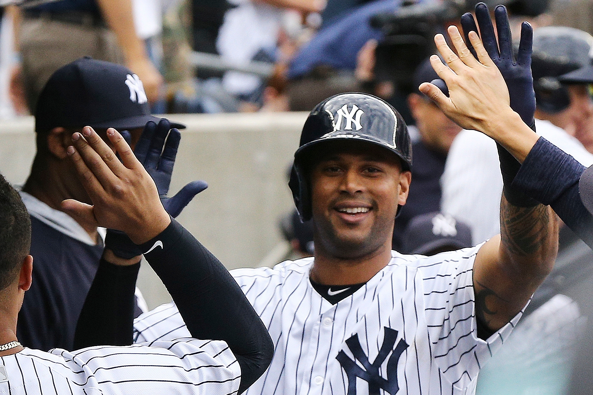 Sep 22, 2018; Bronx, NY, USA; New York Yankees center fielder Aaron Hicks (31) is congratulated after hitting a solo home run against the Baltimore Orioles during the second inning at Yankee Stadium. Mandatory Credit: Andy Marlin-USA TODAY Sports / Andy Marlin