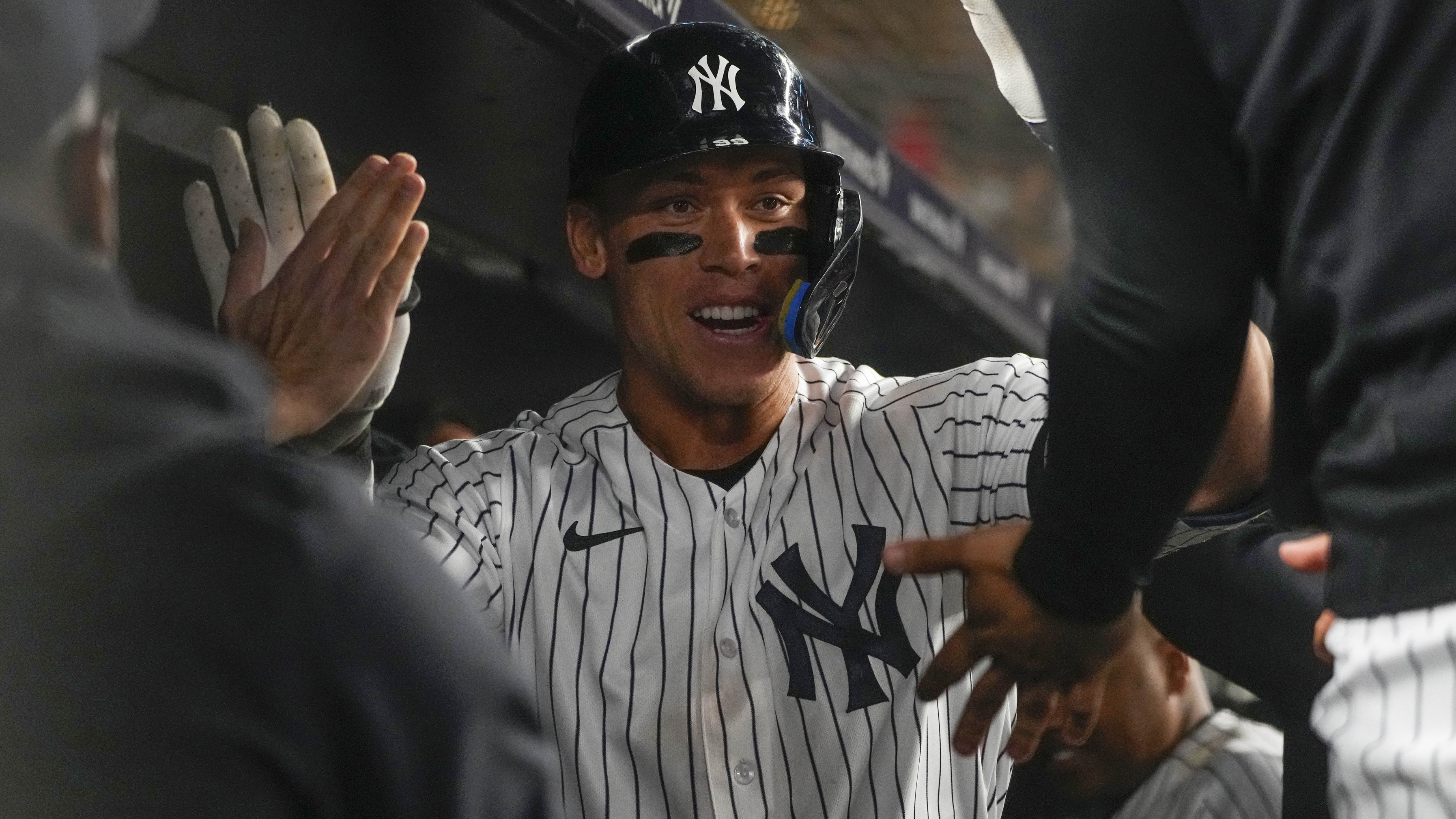 Yankees’ Aaron Judge wins AL Player of the Month for MayJudge slashed .342/.474/.882 and hit 12 home runs in 21 games6/2/2023, 10:55 PMPhillip MartinezEditorial ProducerMay 23, 2023; Bronx, New York, USA; New York Yankees right fielder Aaron Judge (99) is congratulated by teammates for hitting a home run against the Baltimore Orioles during the ninth inning at Yankee Stadium. / Gregory Fisher-USA TODAY Sports