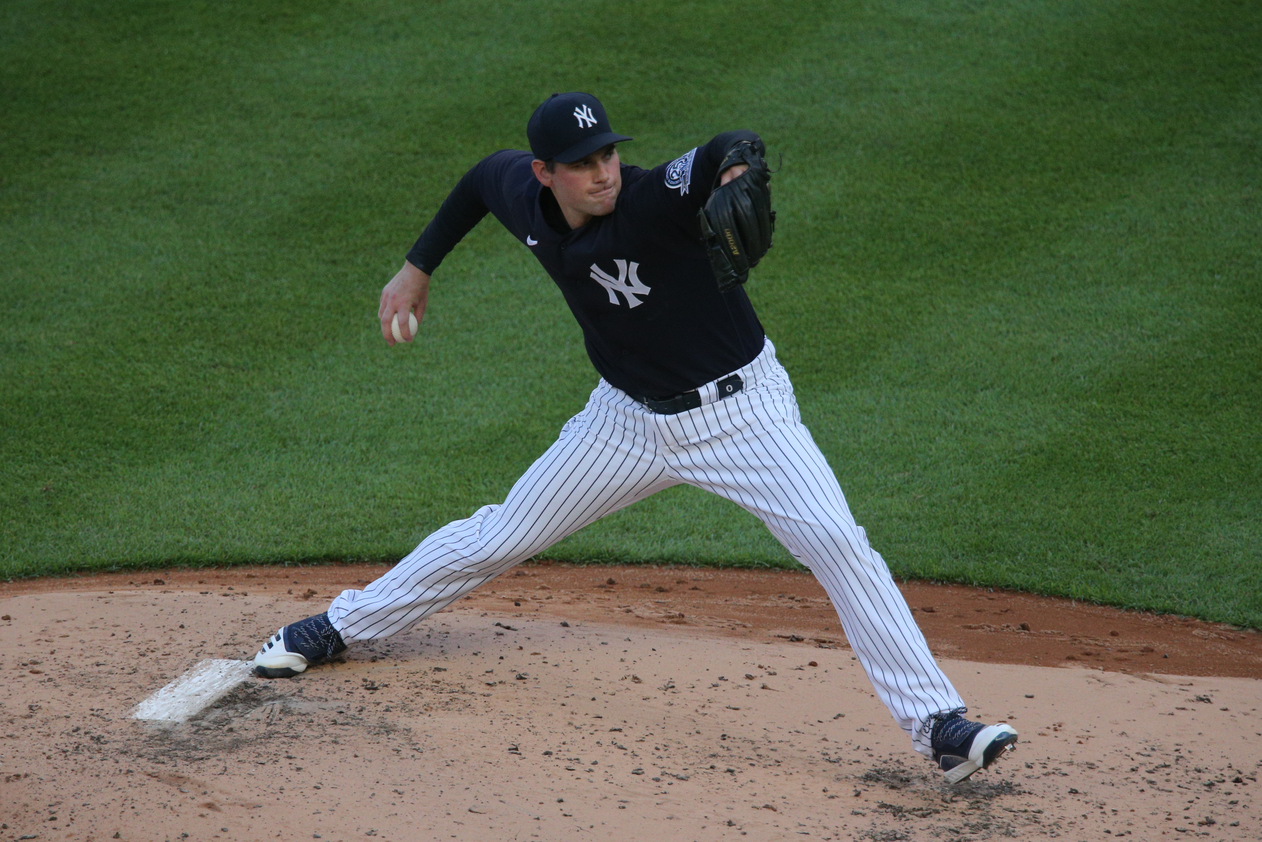 Jul 14, 2020; Bronx, New York, United States; New York Yankees relief pitcher Adam Ottavino (0) pitches during a simulated game during summer camp workouts at Yankee Stadium. Mandatory Credit: Brad Penner-USA TODAY Sports / Brad Penner-USA TODAY Sports