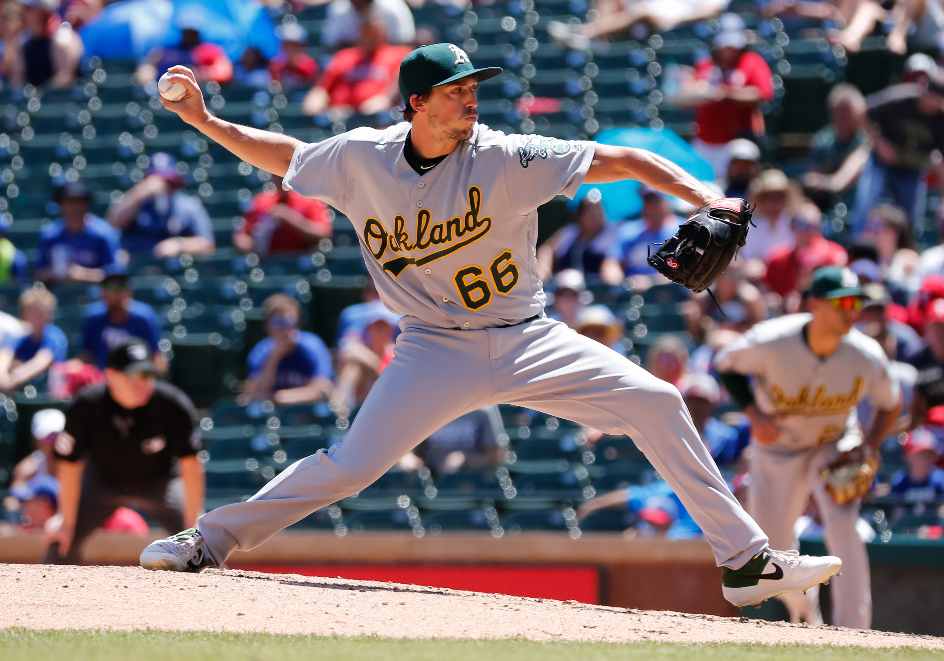 Jun 8, 2019; Arlington, TX, USA; Oakland Athletics relief pitcher Ryan Dull (66) throws during the fifth inning against the Texas Rangers at Globe Life Park in Arlington. Mandatory Credit: Ray Carlin-USA TODAY Sports / Raymond Carlin III