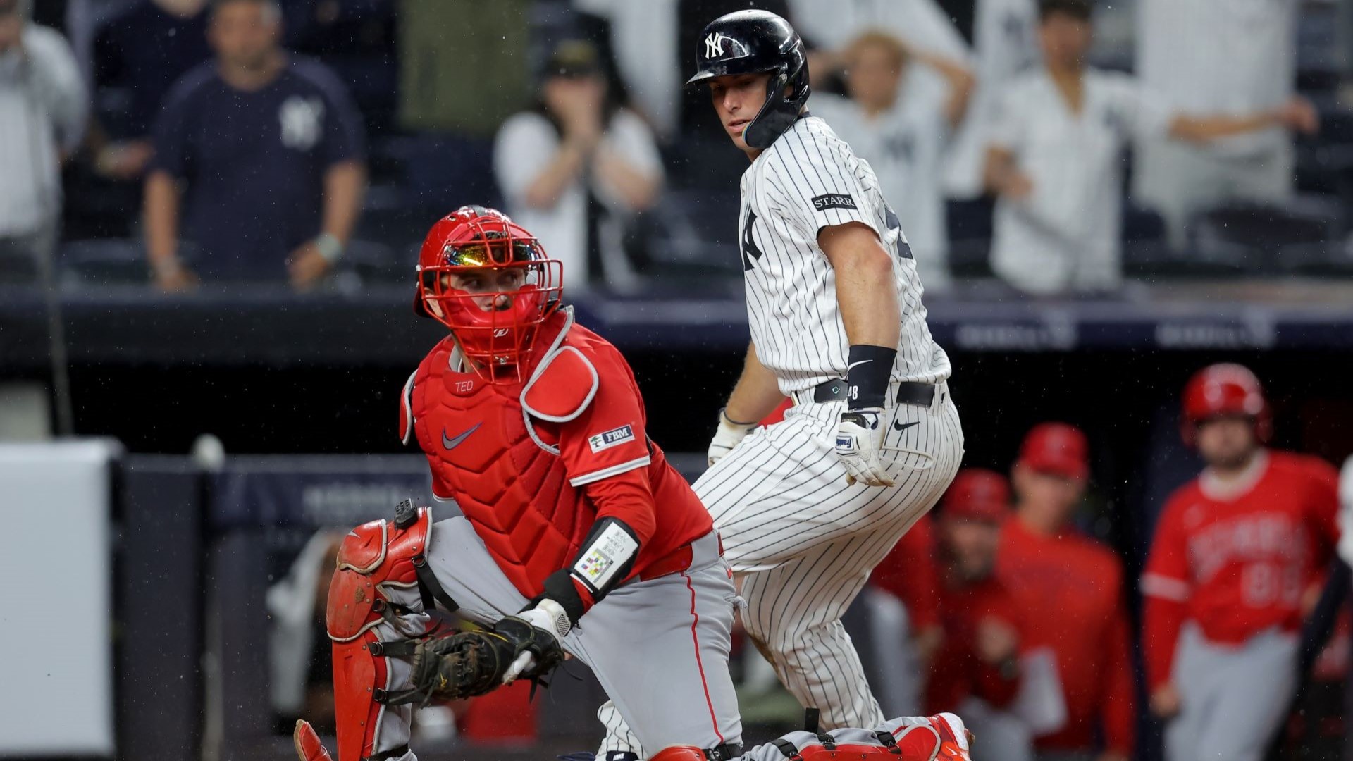 Jun 16, 2025; Bronx, New York, USA; New York Yankees first baseman Paul Goldschmidt (48) reacts after being tagged out at home by Los Angeles Angels catcher Travis d'Arnaud (25) during the eleventh inning at Yankee Stadium. / Brad Penner-Imagn Images
