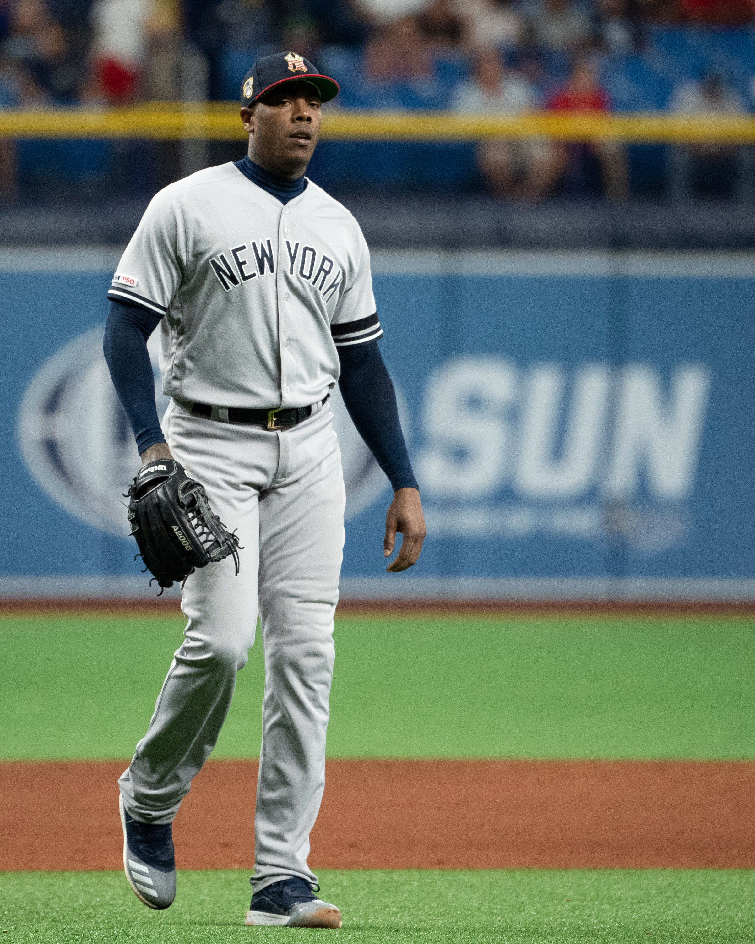 Jul 5, 2019; St. Petersburg, FL, USA; New York Yankees relief pitcher Aroldis Chapman (54) enters the game during the eleventh inning against the Tampa Bay Rays at Tropicana Field. Mandatory Credit: Douglas DeFelice-USA TODAY Sports / Douglas DeFelice