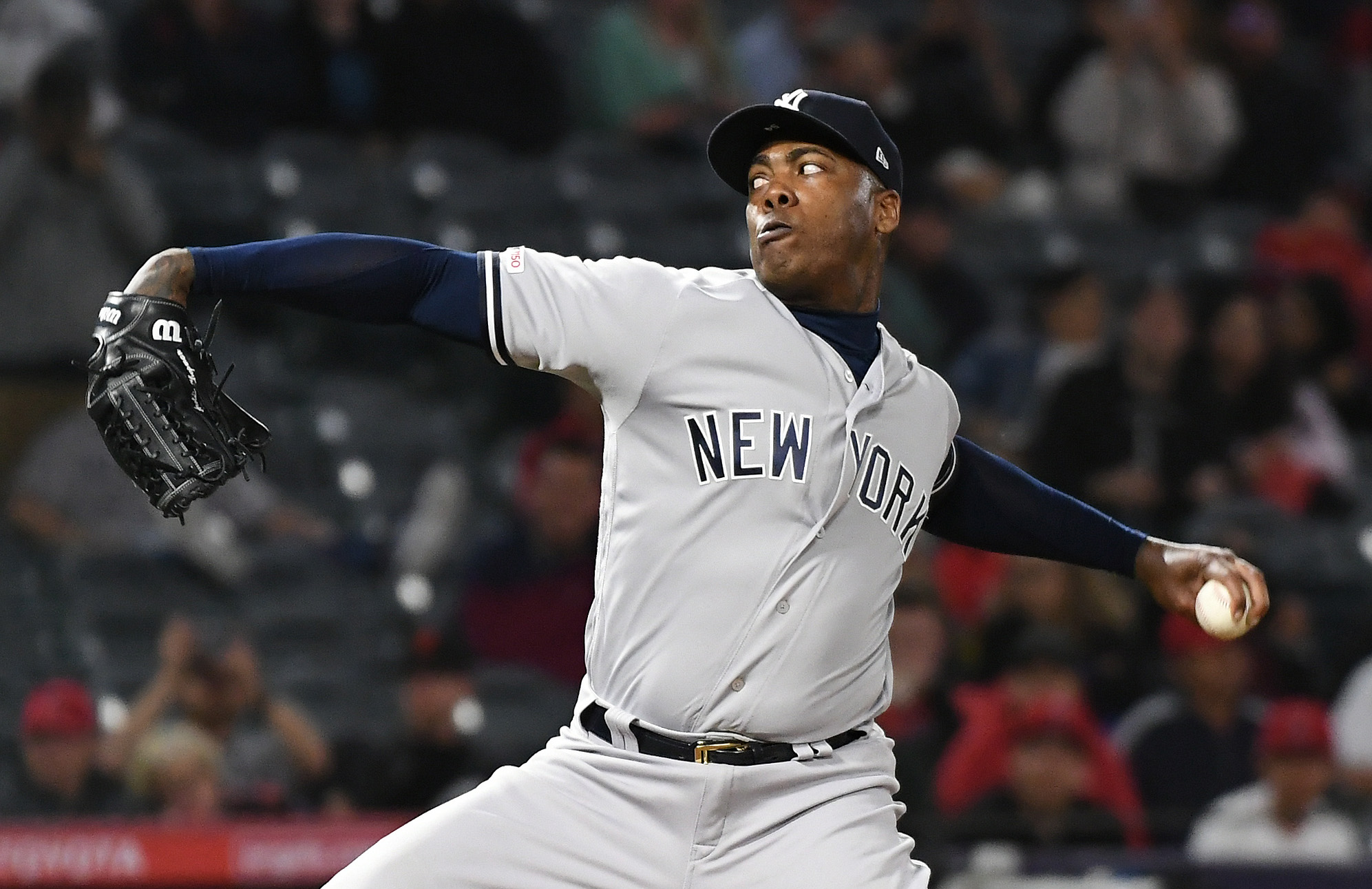 New York Yankees relief pitcher Aroldis Chapman pitches in the 12th inning against the Los Angeles Angels at Angel Stadium of Anaheim. / Richard Mackson/USA TODAY Sports