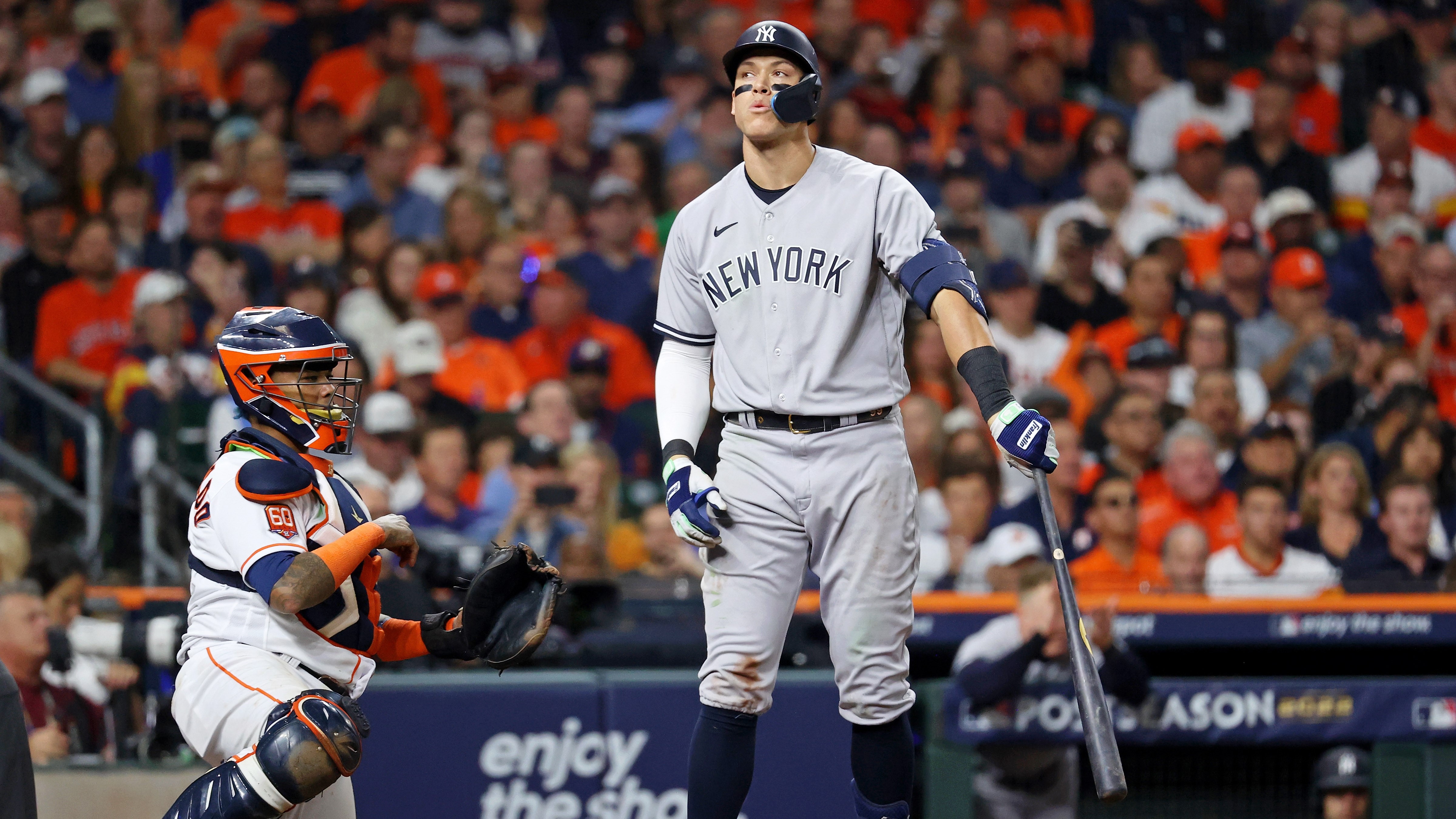 Oct 19, 2022; Houston, Texas, USA; New York Yankees right fielder Aaron Judge (99) reacts during an at bat against the Houston Astros during the fifth inning in game one of the ALCS for the 2022 MLB Playoffs at Minute Maid Park / Troy Taormina-USA TODAY Sports