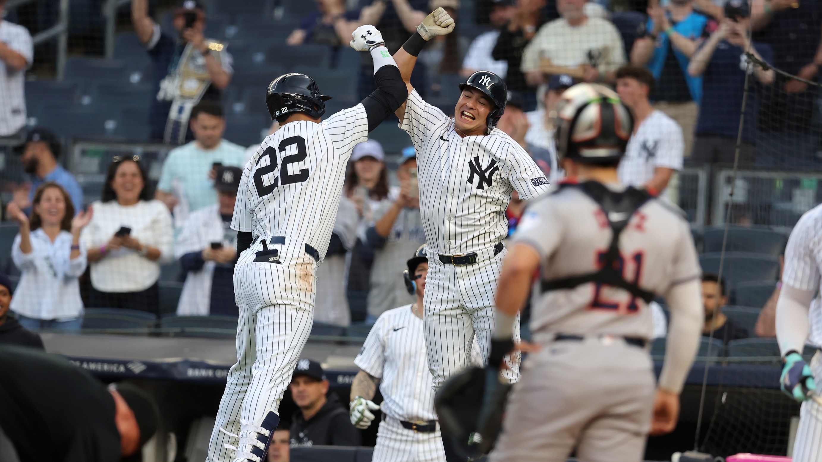 May 8, 2024; Bronx, New York, USA; New York Yankees right fielder Juan Soto (22) celebrates with shortstop Anthony Volpe (11) after hitting a two run home run against the Houston Astros during the first inning at Yankee Stadium. / Brad Penner-USA TODAY Sports