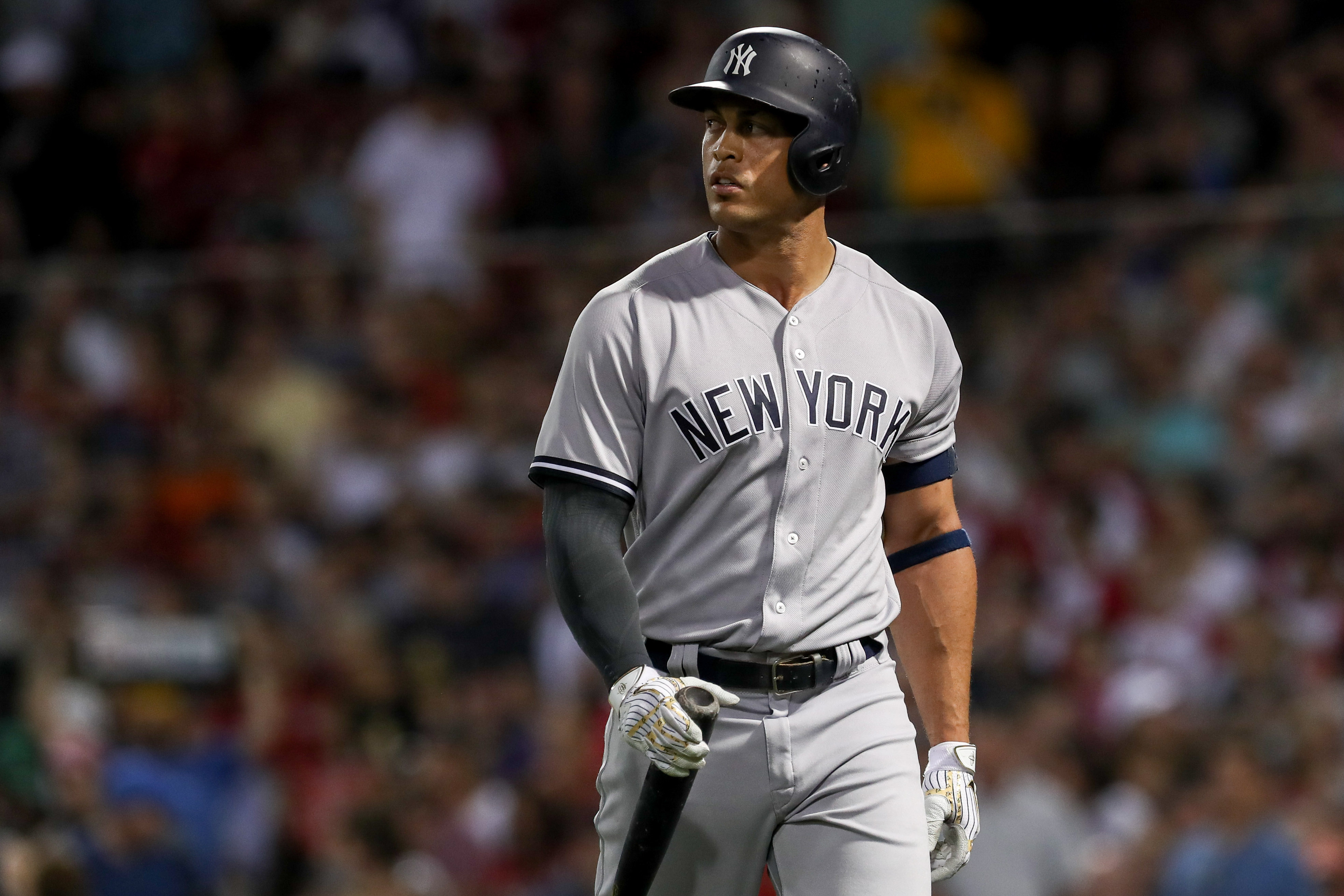 Yankees at Twins, Monday at 8:10 p.m.Happ, Yankees open three-game series9/10/2018, 9:42 PMAug 2, 2018; Boston, MA, USA; New York Yankees left fielder Giancarlo Stanton (27) walks back to the dugout after striking out against the Boston Red Sox at Fenway Park. Mandatory Credit: Paul Rutherford-USA TODAY Sports / Paul Rutherford