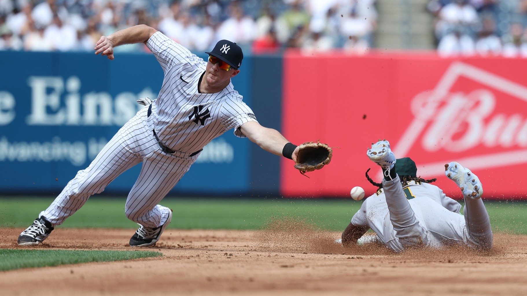 Jun 28, 2025; Bronx, New York, USA; Athletics right fielder Lawrence Butler (4) steals second base as New York Yankees second base DJ LeMahieu (26) can not control the throw during the sixth inning at Yankee Stadium. / Vincent Carchietta-Imagn Images