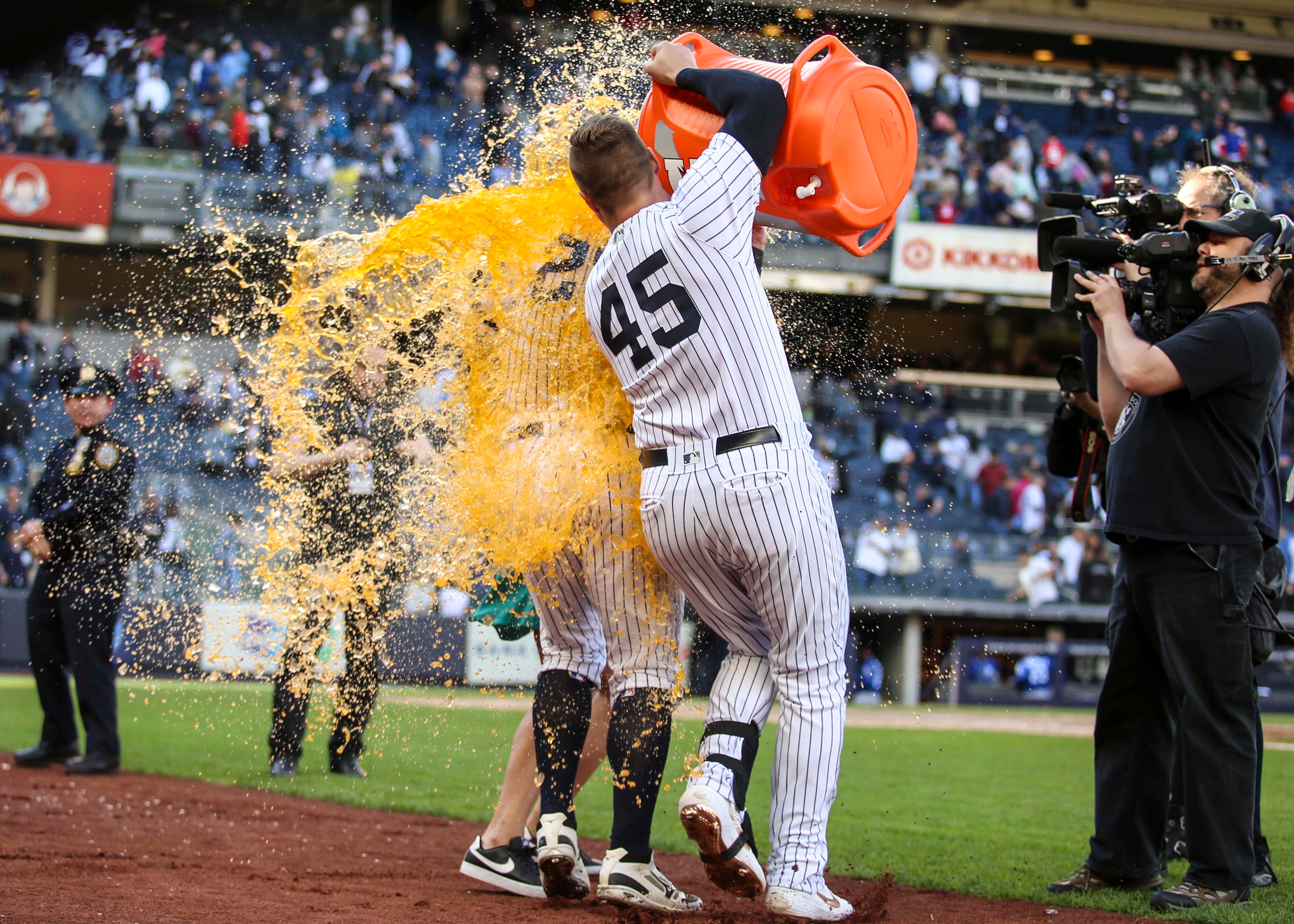 New York Yankees designated hitter Luke Voit pours Gatorade on catcher Austin Romine after his game winning sacrifice fly in the tenth inning beat the Kansas City Royals 7-6 at Yankee Stadium. / Wendell Cruz/USA TODAY Sports