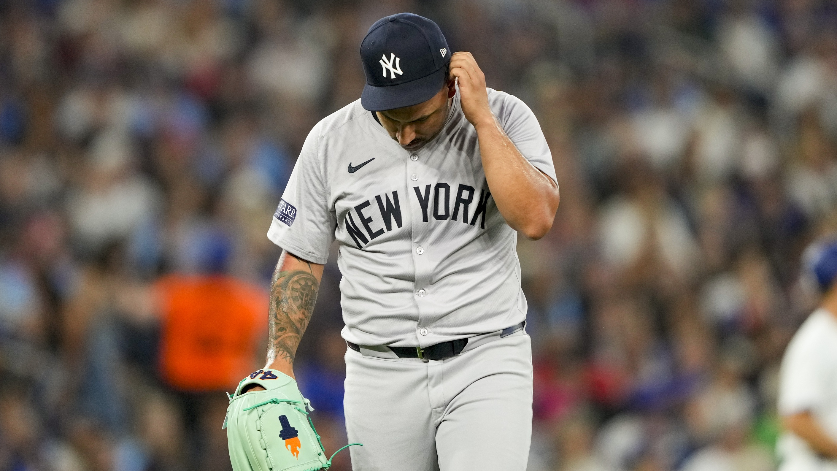 Yankees' bats quiet, bullpen implodes in 9-3 loss to Blue JaysBullpen gave up six runs in the loss6/29/2024, 10:02 PMPhillip MartinezEditorial ProducerJun 29, 2024; Toronto, Ontario, CAN; New York Yankees pitcher Nestor Cortes (65) adjusts his hat after the first inning at an MLB game against the Toronto Blue Jays at Rogers Centre. / Kevin Sousa-USA TODAY Sports