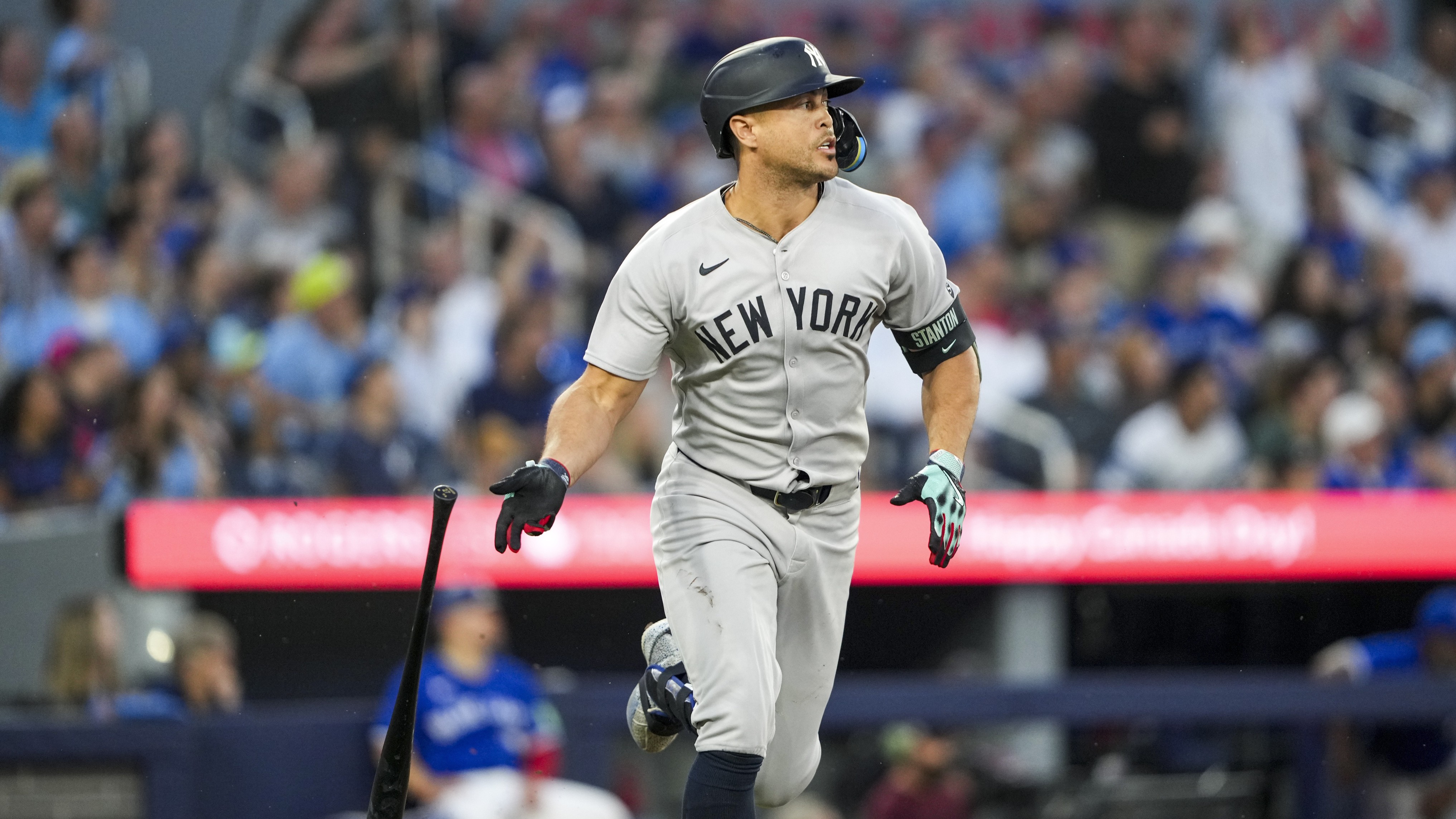 Yankees storm back from eight runs down, but fall short in 11-9 loss to Blue JaysYanks and Blue Jays are tied atop AL East7/3/2025, 2:20 AMPhillip MartinezEditorial ProducerJul 2, 2025; Toronto, Ontario, CAN; New York Yankees designated hitter Giancarlo Stanton (27) hits a home run during the fifth inning in their MLB game against the Toronto Blue Jays at Rogers Centre. / Kevin Sousa-Imagn Images