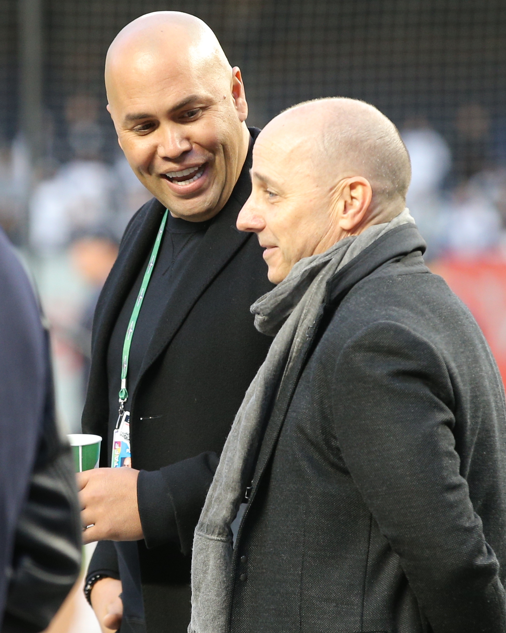Oct 17, 2019; Bronx, NY, USA; New York Yankees former player Carlos Beltran (left) talks to general manager Brian Cashman during batting practice before game four of the 2019 ALCS playoff baseball series against the Houston Astros at Yankee Stadium. Mandatory Credit: Brad Penner-USA TODAY Sportsundefined