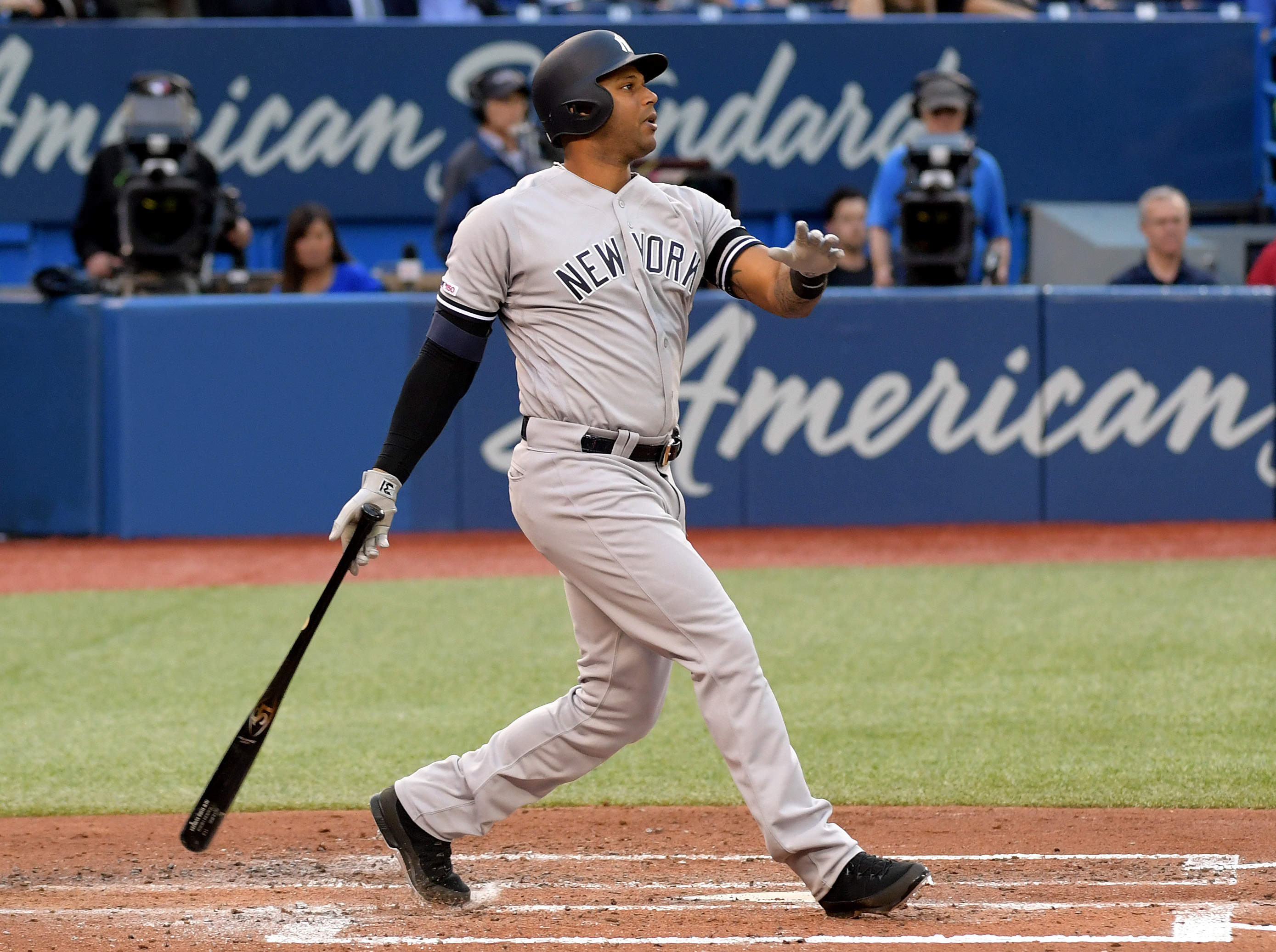 Jun 6, 2019; Toronto, Ontario, CAN; New York Yankees center fielder Aaron Hicks (31) hits a three run home run against Toronto Blue Jays in the second inning at Rogers Centre. Mandatory Credit: Dan Hamilton-USA TODAY Sports / Dan Hamilton