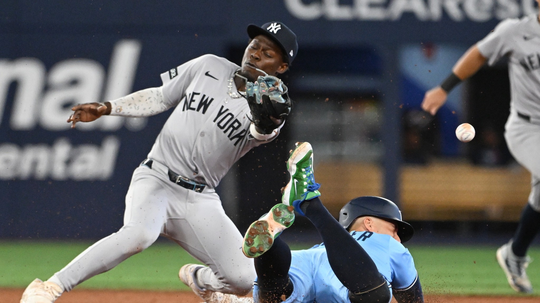 Jul 23, 2025; Toronto, Ontario, CAN; New York Yankees starting pitcher Max Fried (54) stands between third baseman Oswald Peraza (18, left) and shortstop Anthony Volpe (11) as he waits to be relieved in the sixth inning against the Toronto Blue Jays at Rogers Centre / Dan Hamilton-Imagn Images