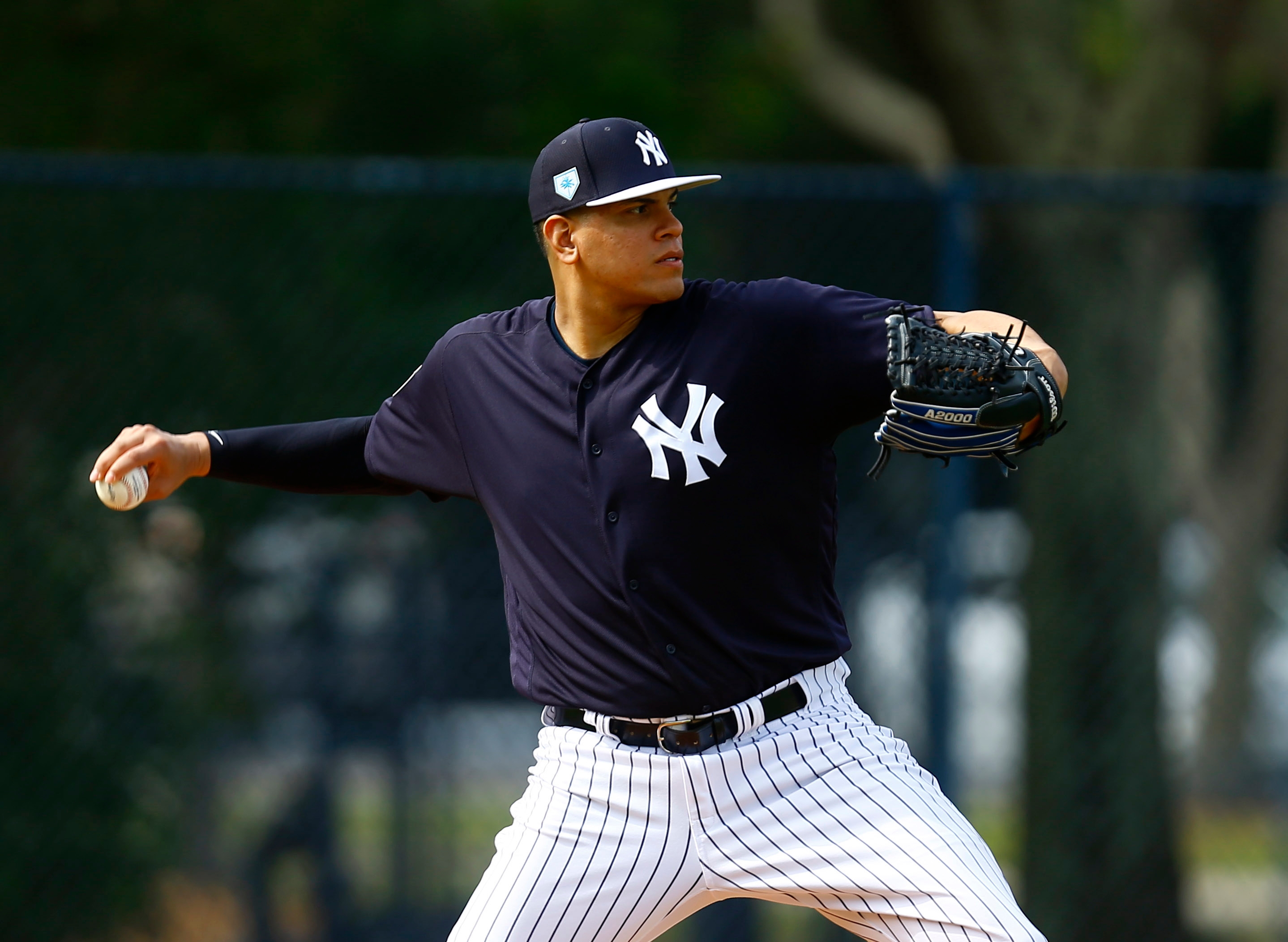 Feb 18, 2019; Tampa, FL, USA; New York Yankees relief pitcher Dellin Betances (68) throws to first base during spring training at George M. Steinbrenner Field. Mandatory Credit: Butch Dill-USA TODAY Sports / Butch Dill