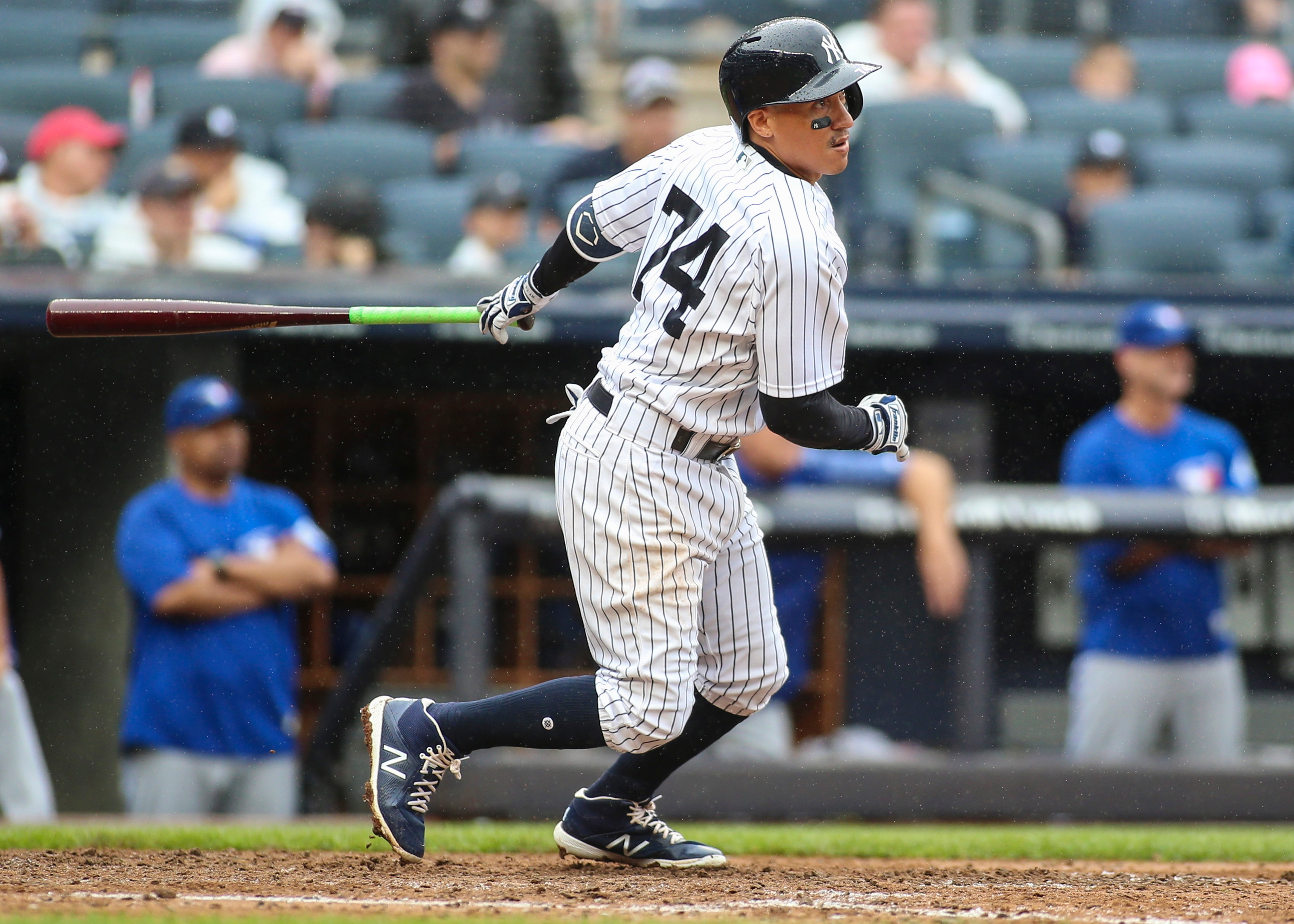 Aug 19, 2018; Bronx, NY, USA; New York Yankees shortstop Ronald Torreyes (74) hits a two run double in the sixth inning against the Toronto Blue Jays at Yankee Stadium. Mandatory Credit: Wendell Cruz-USA TODAY Sports / Wendell Cruz