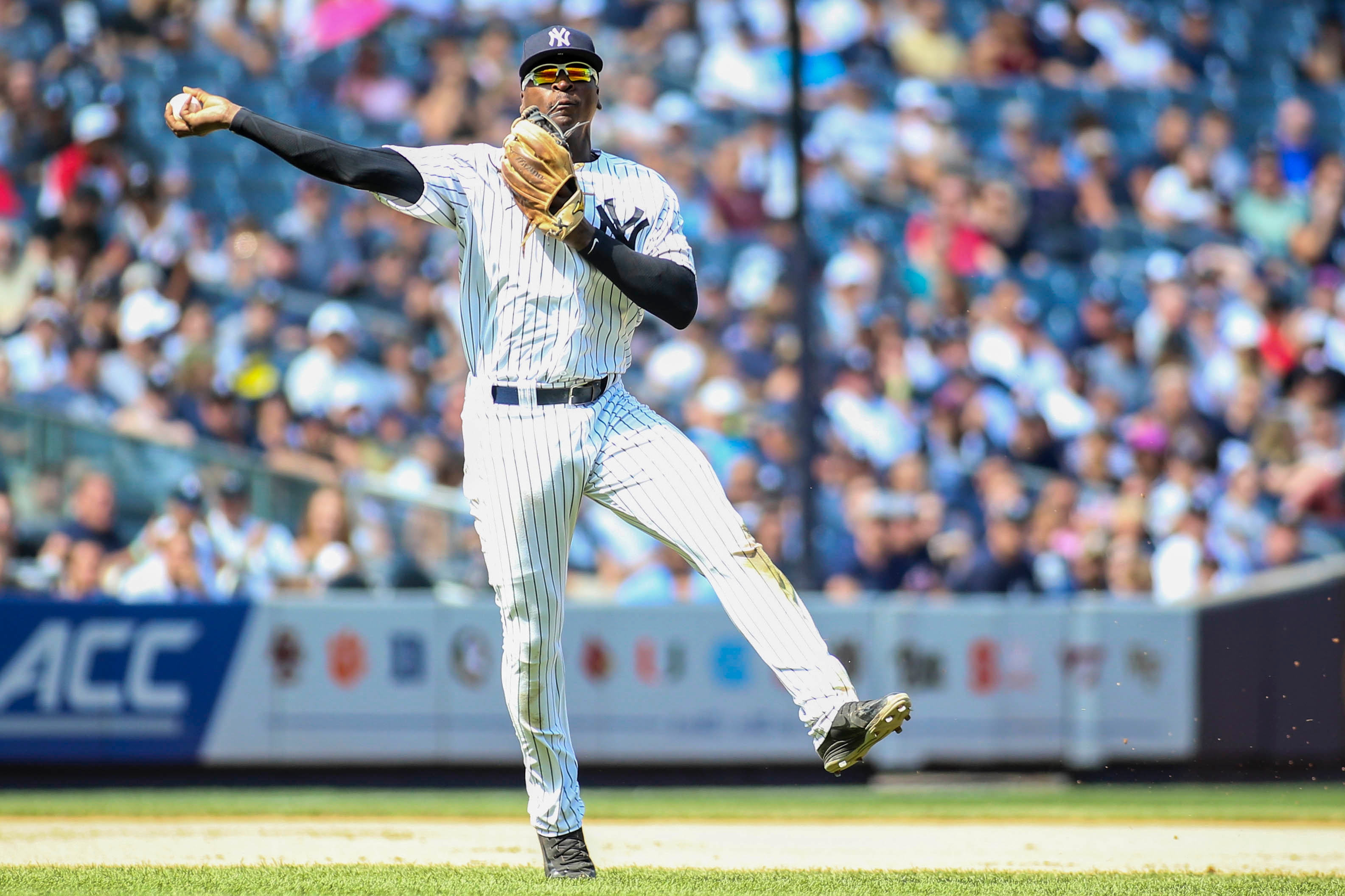 New York Yankees shortstop Didi Gregorius attempting to throw a runner out at first base in the seventh inning against the Texas Rangers at Yankee Stadium. / Wendell Cruz/USA TODAY Sports