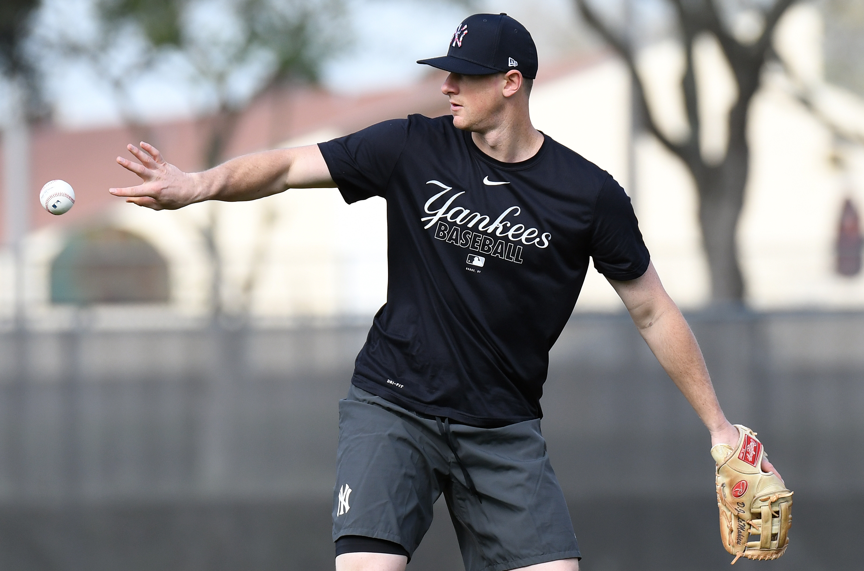 Feb 17, 2020; Tampa, Florida, USA; New York Yankees infielder DJ LeMahieu (26) tosses the ball towards second base during spring training at George M. Steinbrenner Field. Mandatory Credit: Jonathan Dyer-USA TODAY Sports / Jonathan Dyer