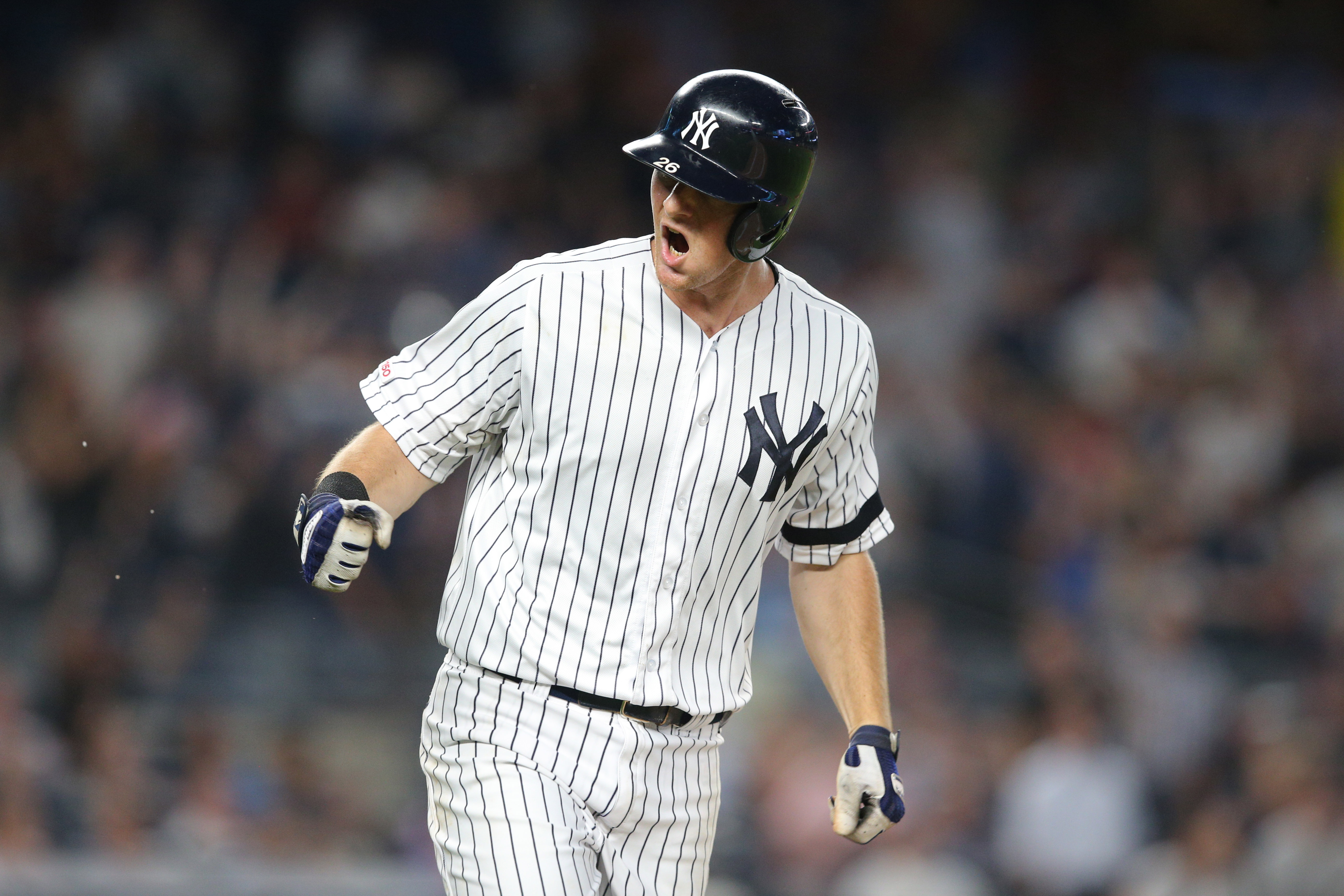 Jul 16, 2019; Bronx, NY, USA; New York Yankees third baseman DJ LeMahieu (26) reacts after hitting a solo home run against the Tampa Bay Rays during the sixth inning at Yankee Stadium. Mandatory Credit: Brad Penner-USA TODAY Sports / Brad Penner
