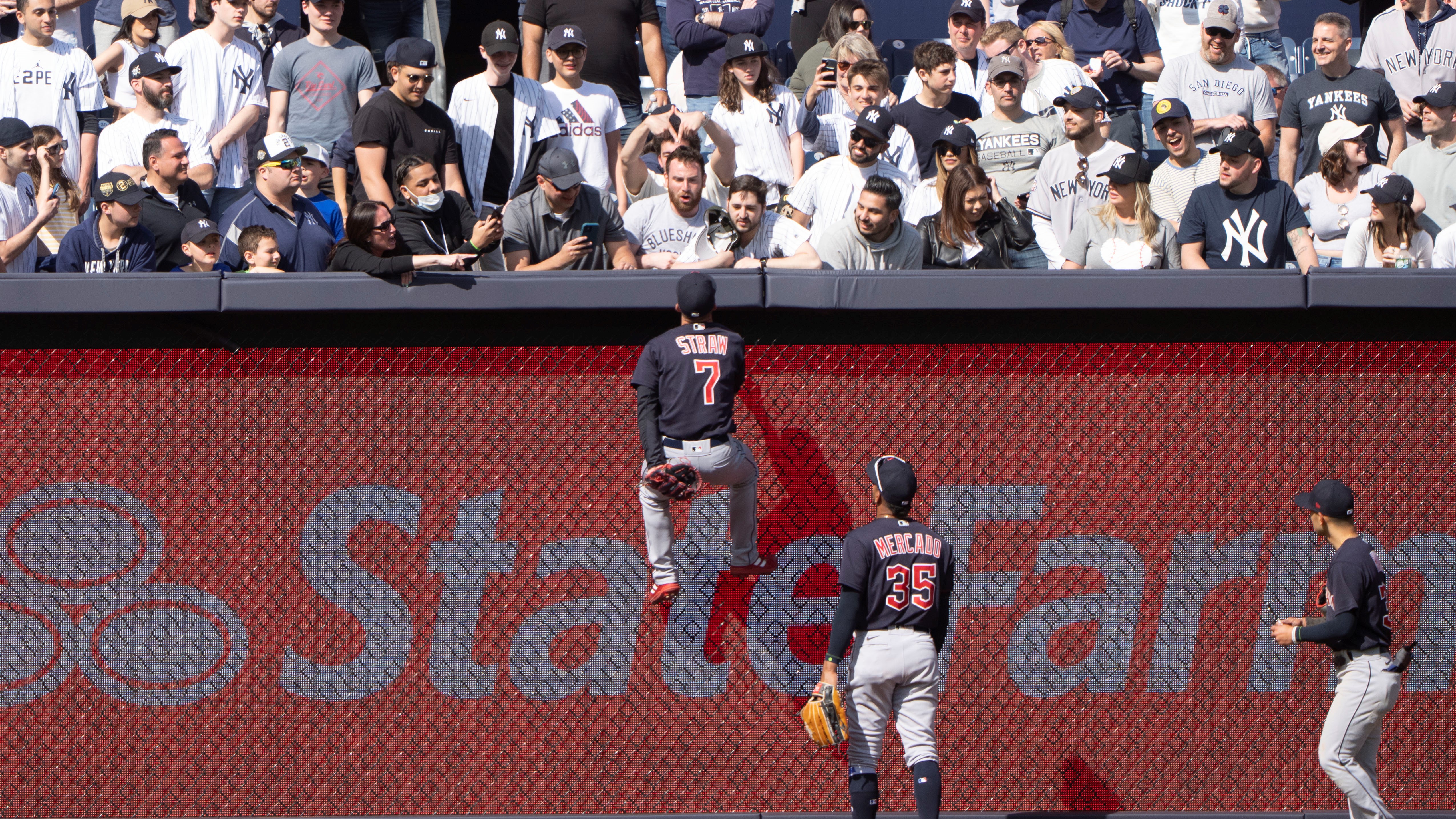 Yankees fans throw trash, get into altercation with Guardians outfielders following Saturday's final outCleveland OF Myles Straw climbed left field wall to confront fans4/23/2022, 9:16 PMPhillip MartinezEditorial Producer