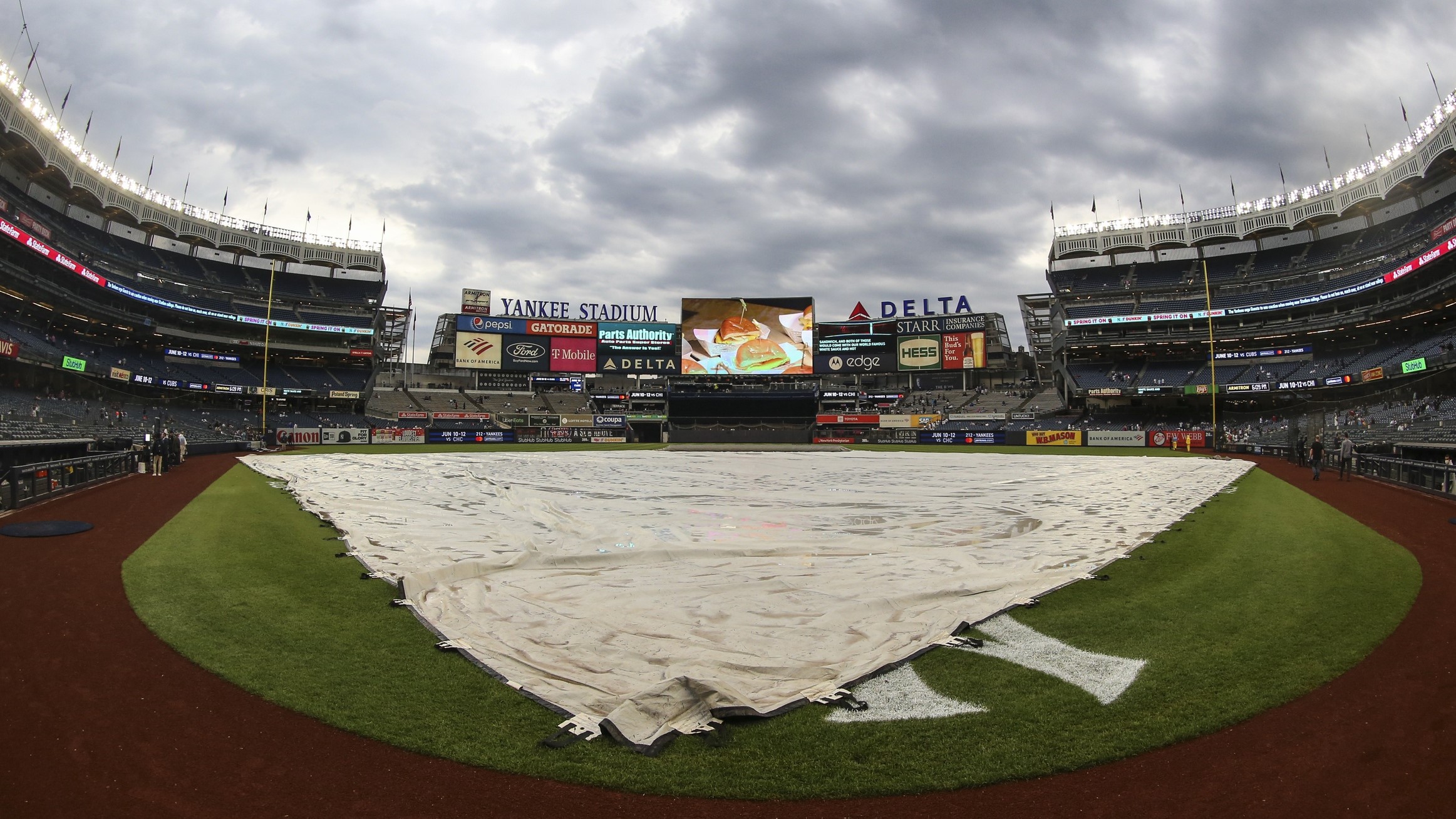Yankees game vs. Angels postponed to Thursday doubleheaderCortes-Ohtani is the Game 1 matchup followed by Taillon-Detmers6/1/2022, 11:58 PMScott ThompsonEditorial ProducerApr 14, 2022; Bronx, New York, USA; The tarp is placed over the field prior to the game between the Toronto Blue Jays and the New York Yankees at Yankee Stadium. / Wendell Cruz-USA TODAY Sports