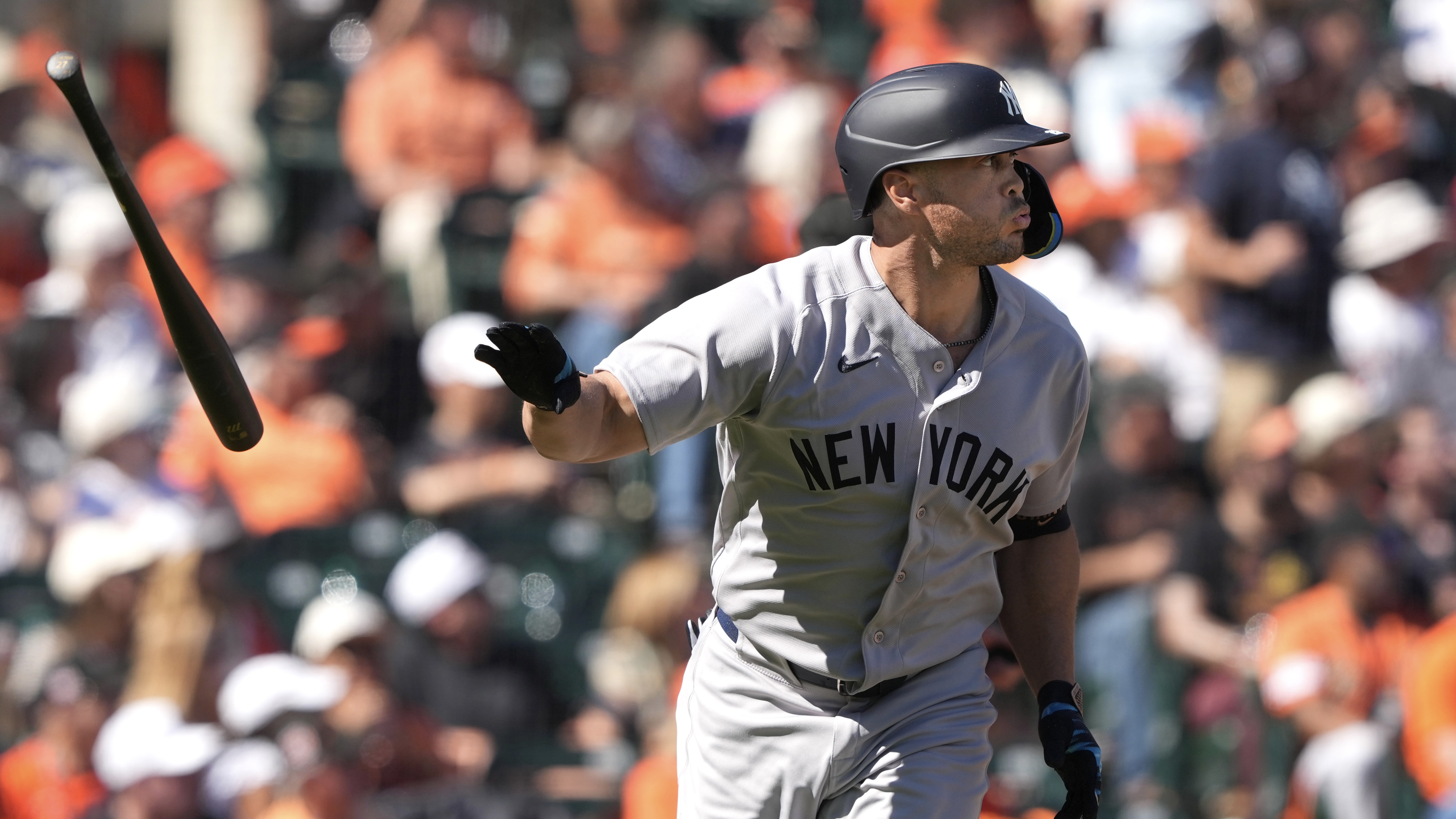 New York Yankees designated hitter Giancarlo Stanton (27) tosses his bat after hitting a home run against the San Francisco Giants during the sixth inning at Oracle Park. / Darren Yamashita-Imagn Images