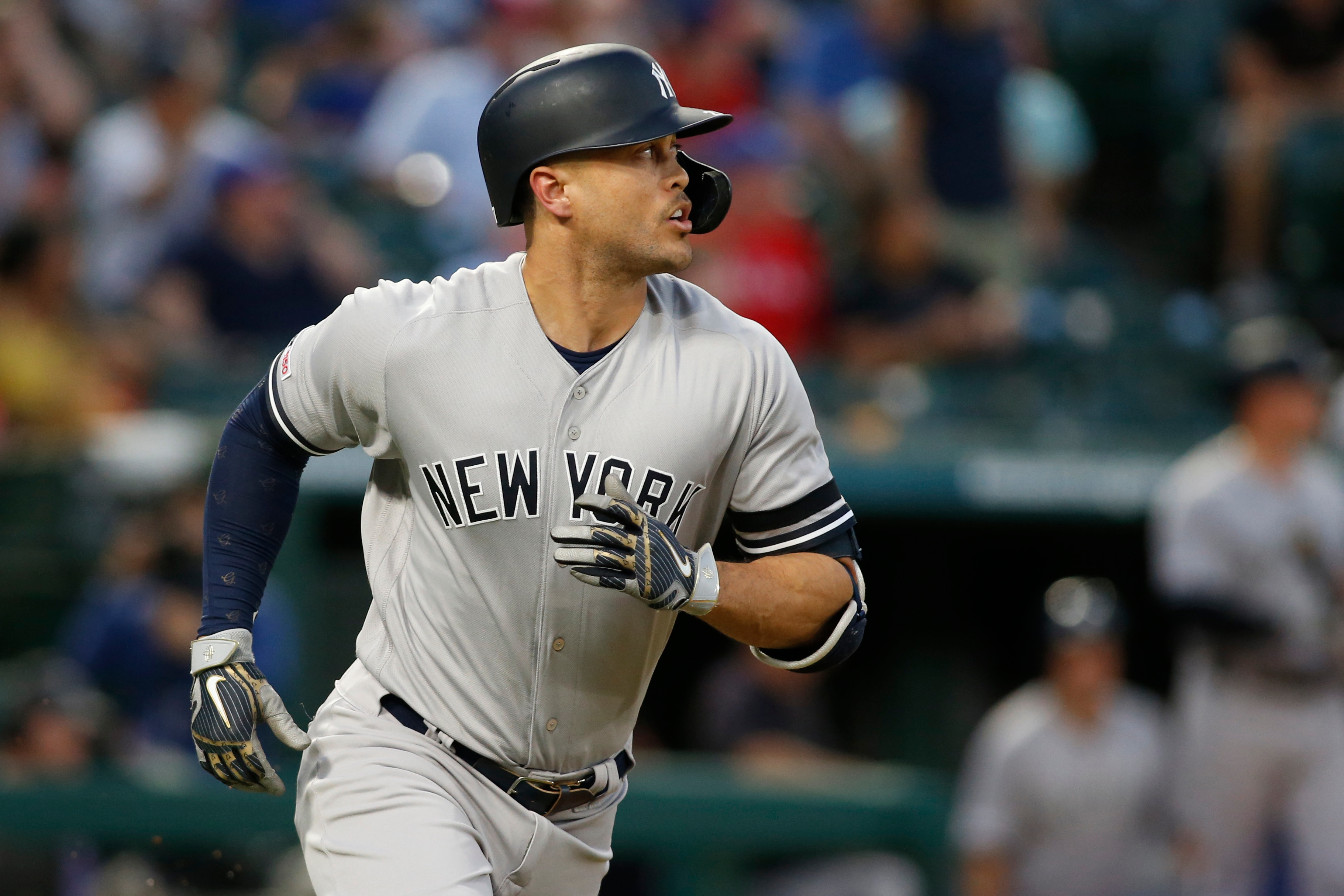 Sep 27, 2019; Arlington, TX, USA; New York Yankees left fielder Giancarlo Stanton (27) watches his home run in the first inning against the Texas Rangers at Globe Life Park in Arlington. Mandatory Credit: Tim Heitman-USA TODAY Sports / Tim Heitman