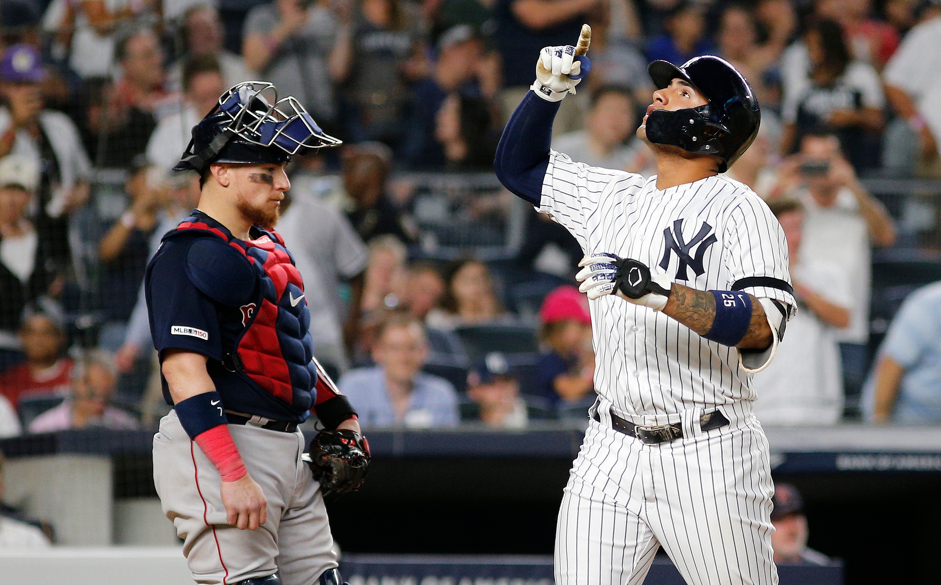 Aug 3, 2019; Bronx, NY, USA; New York Yankees shortstop Gleyber Torres (25) reacts after hitting a solo home run against the Boston Red Sox during the fifth inning of game two of a doubleheader at Yankee Stadium. Mandatory Credit: Andy Marlin-USA TODAY Sports / Andy Marlin