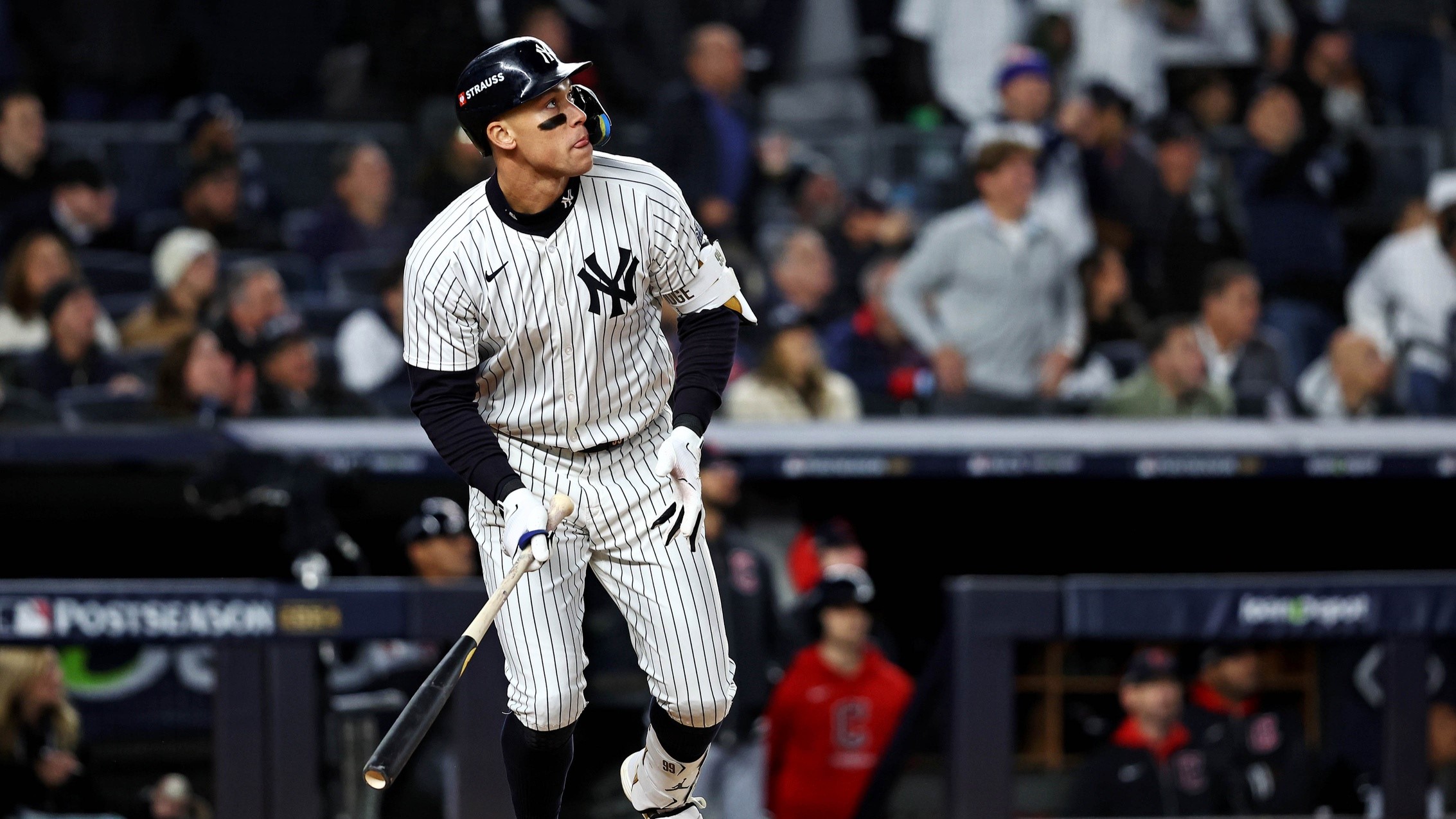 Oct 15, 2024; Bronx, New York, USA; New York Yankees outfielder Aaron Judge (99) hits a two run home run during the seventh inning against the Cleveland Guardians in game two of the ALCS for the 2024 MLB Playoffs at Yankee Stadium. / Wendell Cruz-Imagn Images