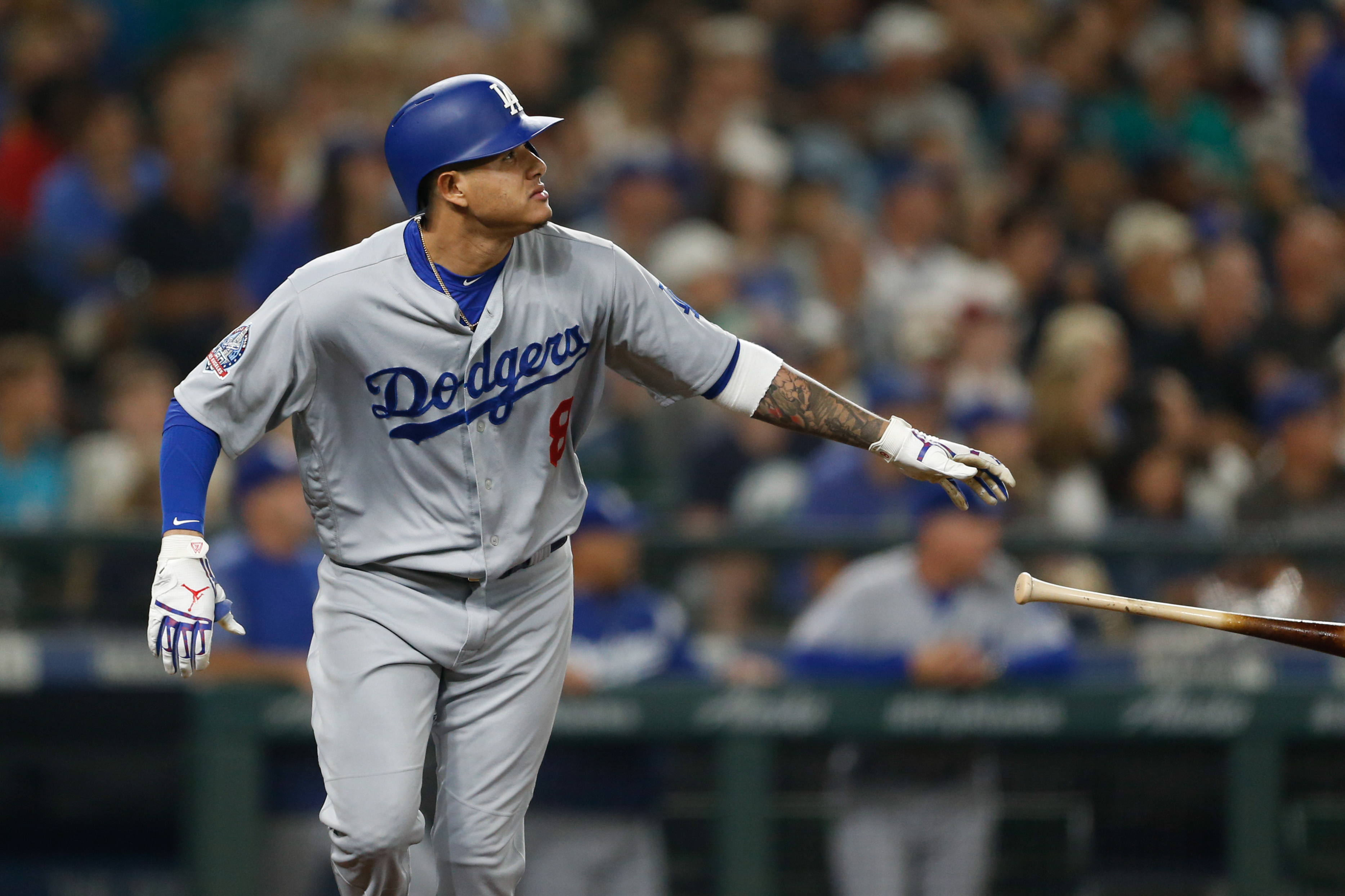 Aug 17, 2018; Seattle, WA, USA; Los Angeles Dodgers shortstop Manny Machado (8) tosses his bat after hitting a home run against the Seattle Mariners at Safeco Field. Mandatory Credit: Jennifer Buchanan-USA TODAY Sports / Jennifer Buchanan