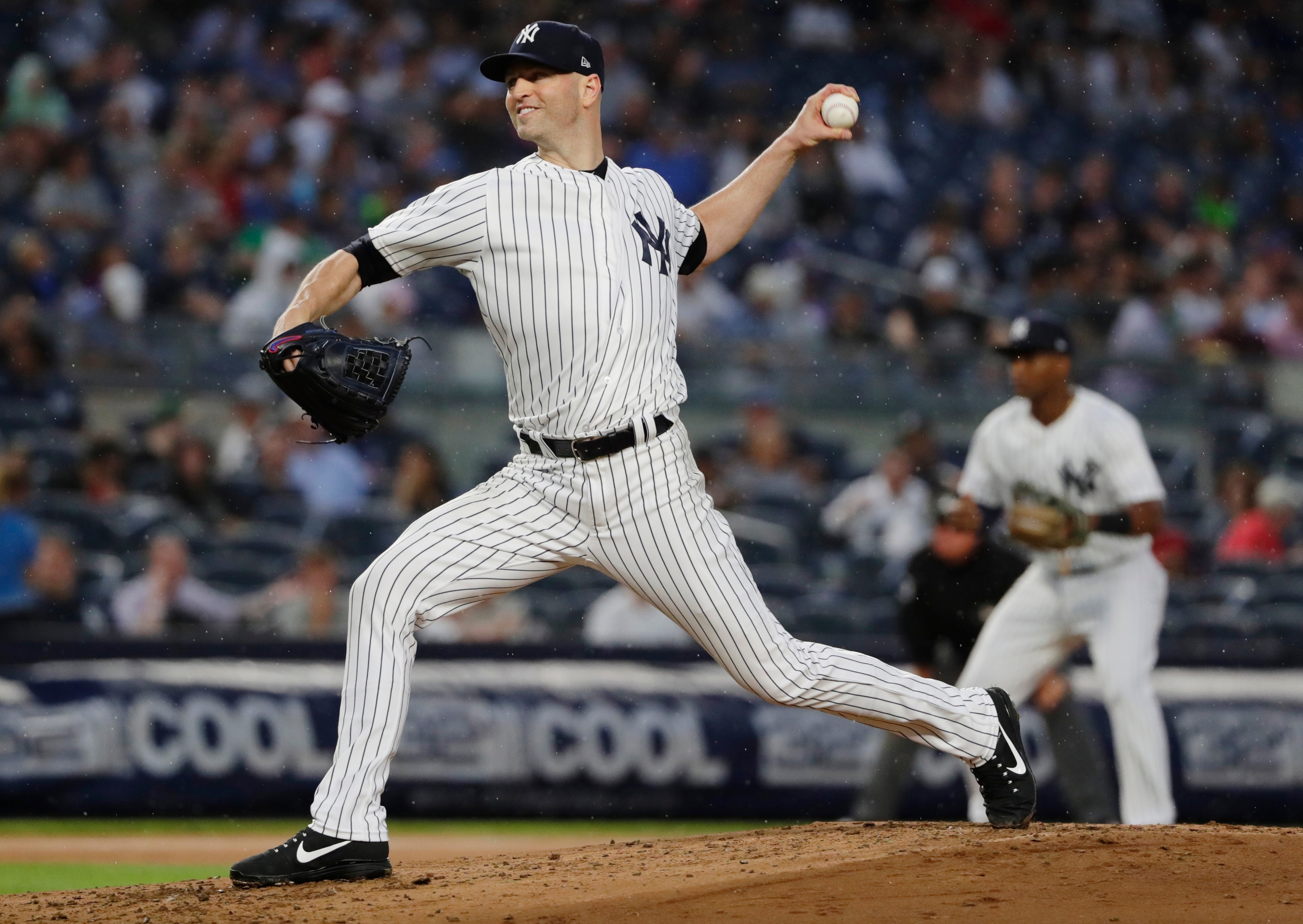 New York Yankees' J.A. Happ delivers a pitch during the first inning of a baseball game against the Tampa Bay Rays Tuesday, Aug. 14, 2018, in New York. (AP Photo/Frank Franklin II) / Frank Franklin II/AP