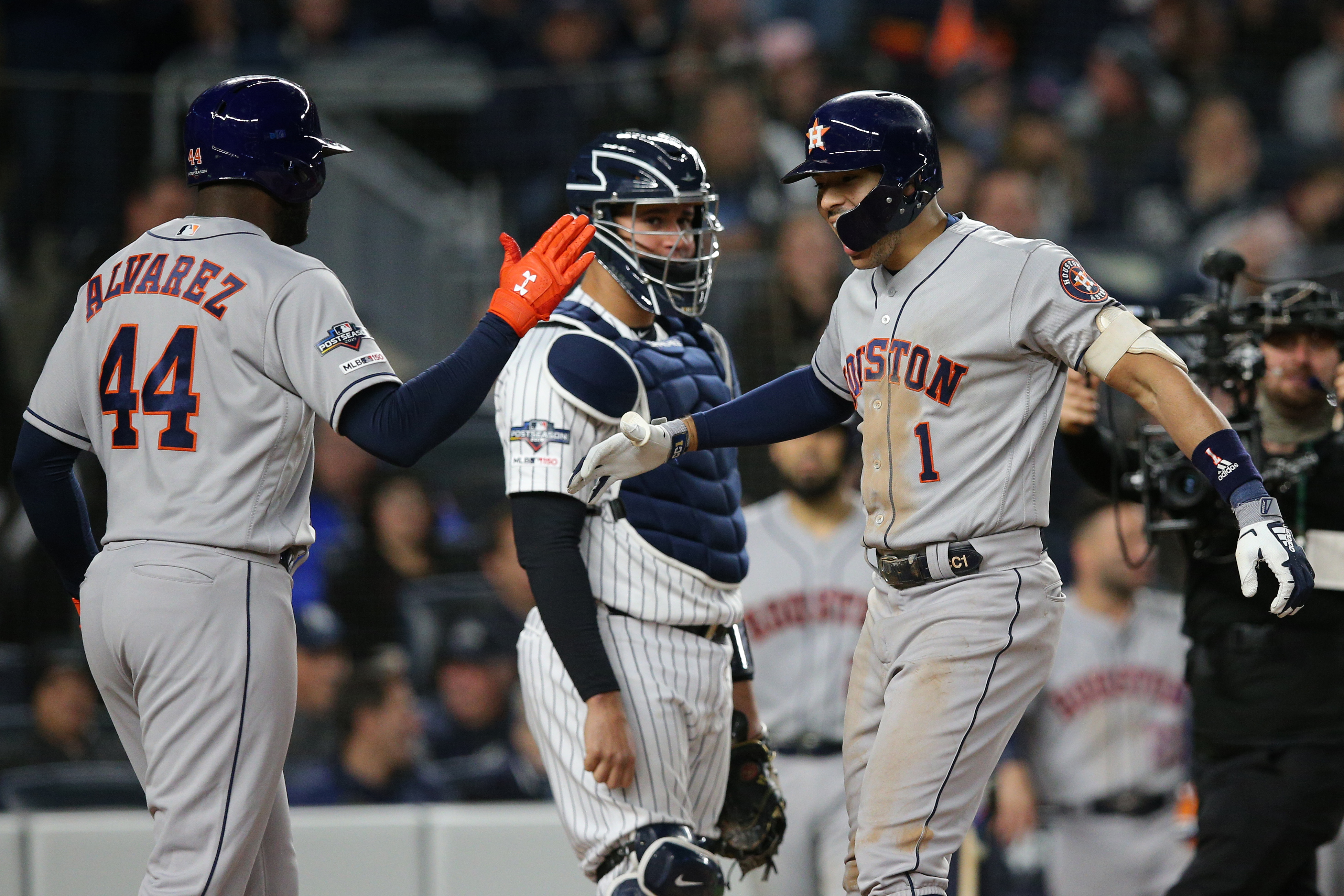 Oct 17, 2019; Bronx, NY, USA; Houston Astros shortstop Carlos Correa (1) celebrates with designated hitter Yordan Alvarez (44) after hitting a three run home run as New York Yankees catcher Gary Sanchez (24) looks on during the sixth inning of game four of the 2019 ALCS playoff baseball series at Yankee Stadium. Mandatory Credit: Brad Penner-USA TODAY Sports / Brad Penner