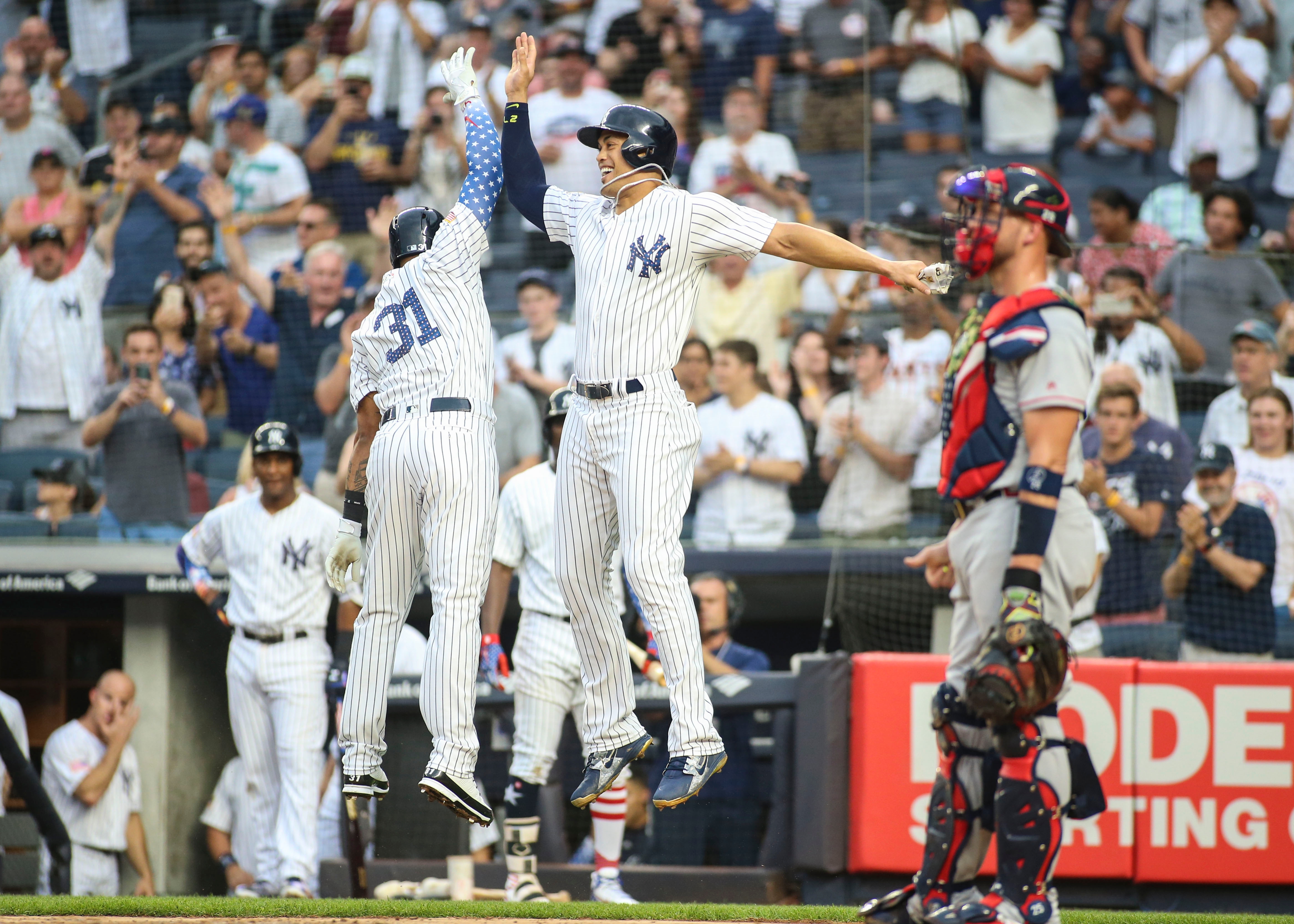 Jul 3, 2018; Bronx, NY, USA; New York Yankees right fielder Giancarlo Stanton (27) greets center fielder Aaron Hicks (31) after he hit a two run home run in the first inning against the Atlanta Braves at Yankee Stadium. Mandatory Credit: Wendell Cruz-USA TODAY Sports / Wendell Cruz