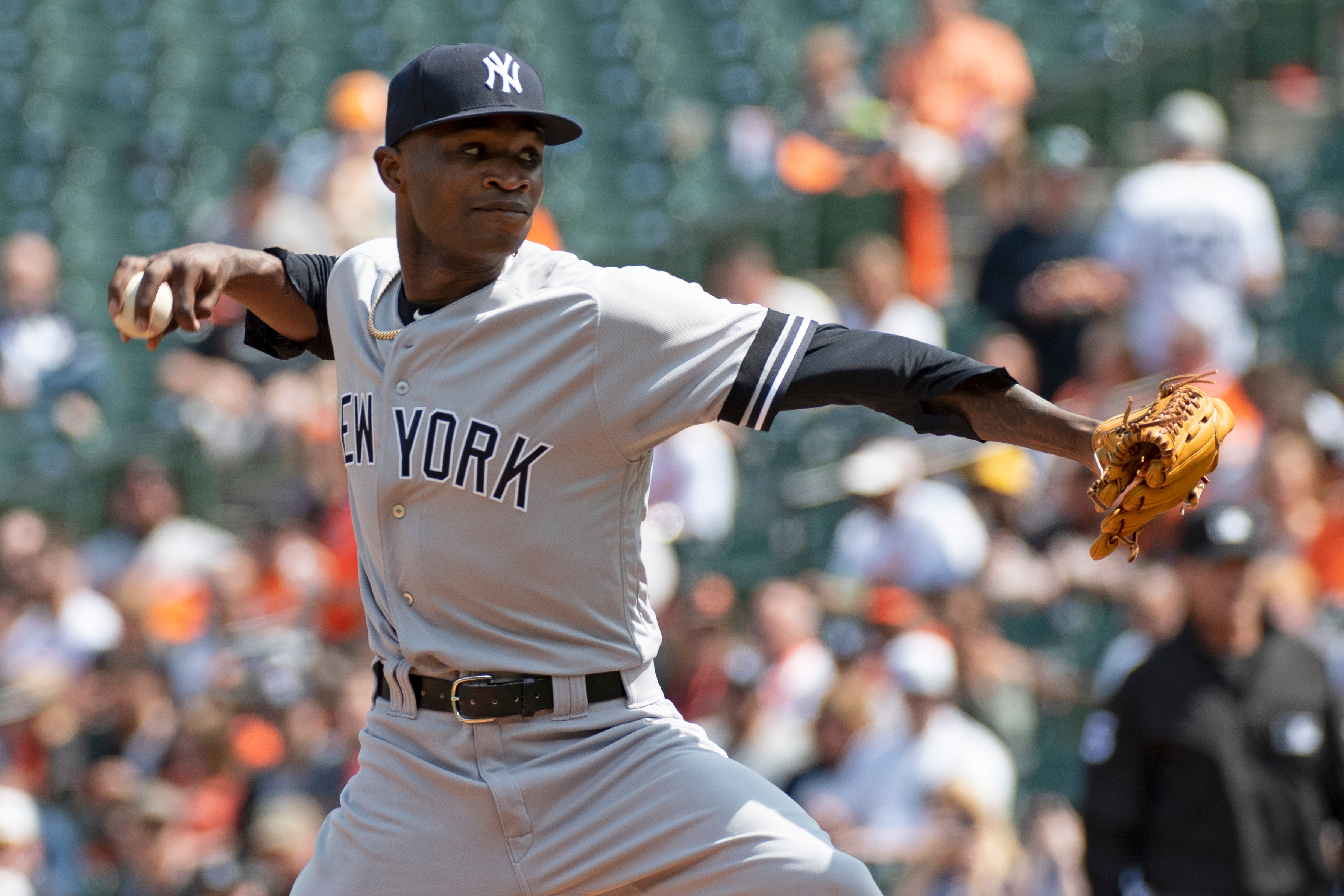 New York Yankees starting pitcher Domingo German delivers a pitch during the first inning against the Baltimore Orioles at Oriole Park at Camden Yards. / Tommy Gilligan/USA TODAY Sports