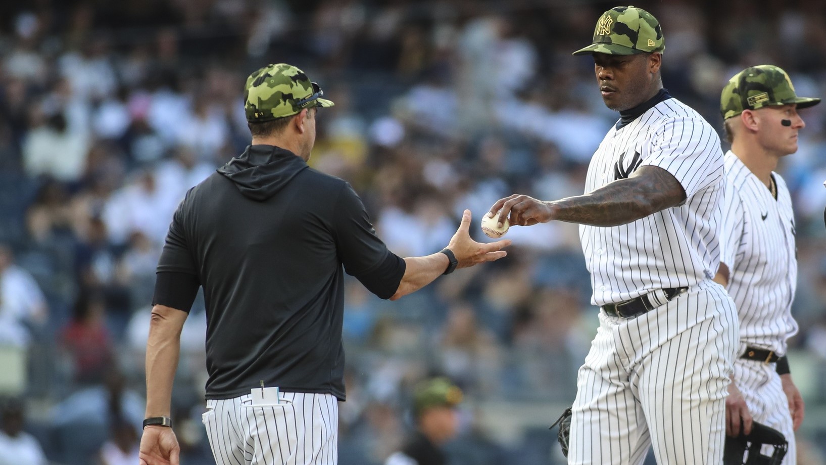 May 22, 2022; Bronx, New York, USA; New York Yankees relief pitcher Aroldis Chapman (54) is taken out by manager Aaron Boone (17) in the ninth inning after blowing the save against the Chicago White Sox at Yankee Stadium. / Wendell Cruz-USA TODAY Sports